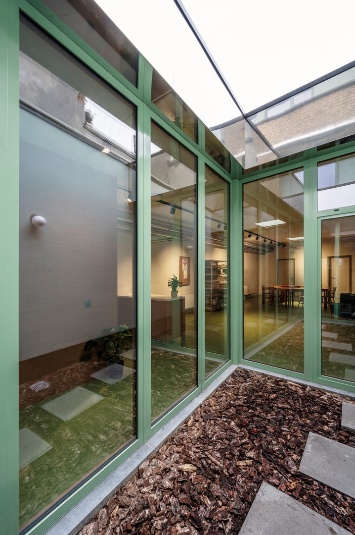 L'équipe de construction a procédé à une intervention structurelle, mais elle a été bien calculée : un patio a été créé au rez-de-chaussée pour faire pénétrer la lumière jusqu'au coeur de l'intérieur du bureau.