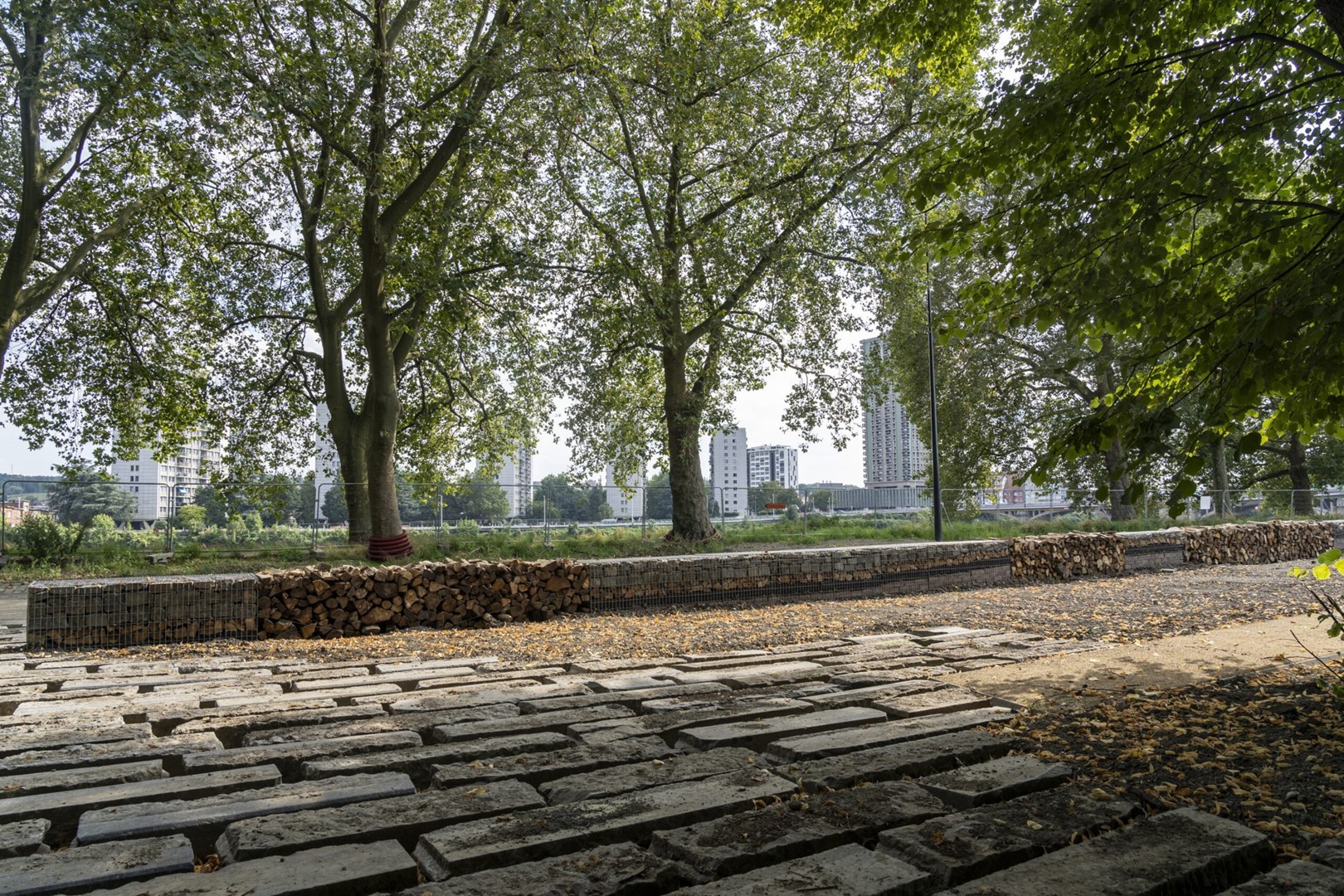 Les équipes de Sweco ont également intégré des matériaux de réemploi via des "murets empilables", servant de mobilier urbain, de démarcation, d’habitat pour les petits mammifères et les insectes et abritant des plantes résistant à la sécheresse. Ces murets ont en effet été construits à l’aide de matériaux déjà présents sur le site, ce qui réduit le besoin de nouveaux matériaux et préserve l’héritage historique du site. Environ 1.300 m³ de pavés et de dalles en béton présents sur le site ont pu être réutilisés. Ce volume important de matériaux réutilisables a contribué à la mise en œuvre de la circularité dans le projet, en minimisant les besoins en nouvelles ressources et en réduisant l’impact sur l’environnement.
