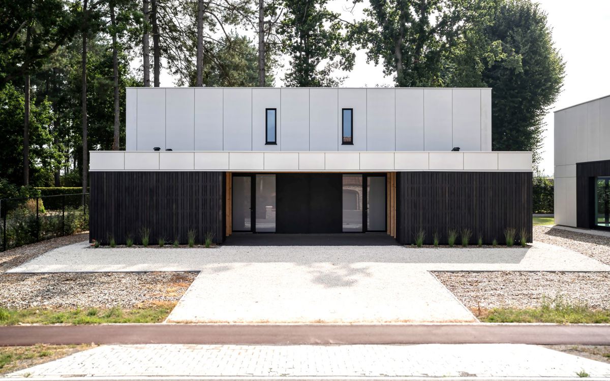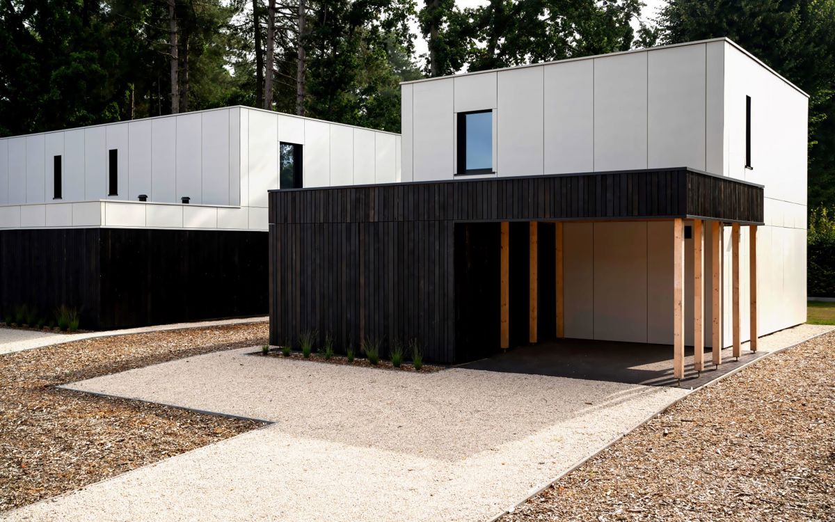 « Chaque maison présente un mélange de lattes en bois brûlé et de panneaux de façade EQUITONE [natura] gris. Les cinq maisons sont divisées en trois blocs, chacun présentant un jeu différent de matériaux de façade. On retrouve les mêmes matériaux partout, mais chaque fois avec une application légèrement différente. Pour une maison, le carport est par exemple constitué entièrement de lattes en bois ; pour une autre, seuls les poteaux sont en bois et des panneaux EQUITONE gris sont encore posés par-dessus. Nous avons choisi les panneaux EQUITONE [natura] gris en combinaison avec la couleur sombre du bois pour créer un joli contraste entre les deux matériaux. Nous recherchions un aspect naturel proche du béton, et cette variante des panneaux EQUITONE était parfaite. »