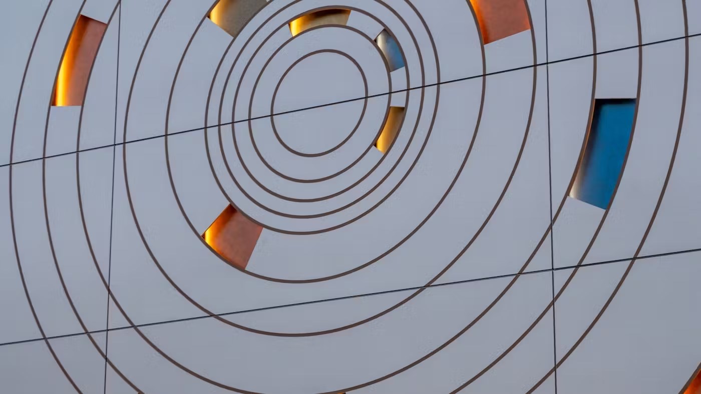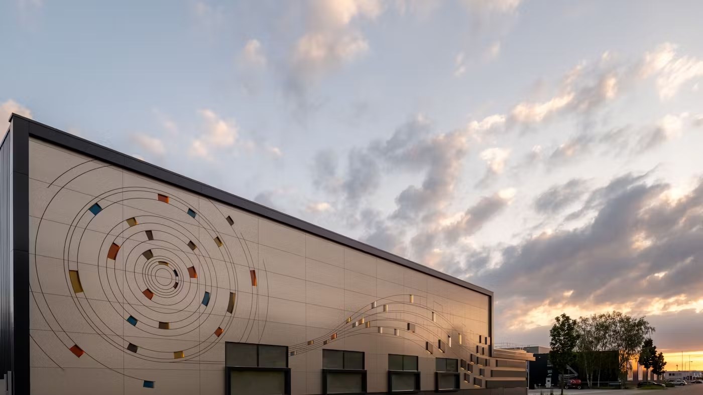 Le design final de la façade a été imaginé par Jelena Ivanisevic, responsable du support technique chez Rockpanel et formée en architecture. « Dans ce design, trois perspectives distinctes sont tissées en un seul récit, avec la durabilité comme thème central. De gauche à droite, des cercles grands et petits symbolisent la circularité de Rockpanel. Pour nous, la circularité signifie l’utilisation de matériaux recyclés et la réutilisation de nos panneaux », explique Ivanisevic. « La façade exprime la liberté de conception et démontre la polyvalence de Rockpanel : perforations, courbes, éléments 3D, designs variés, éclairage intégré et gravures. Derrière les lignes gravées, les panneaux se patinent naturellement sous l’effet des éléments comme le soleil et la pluie. »