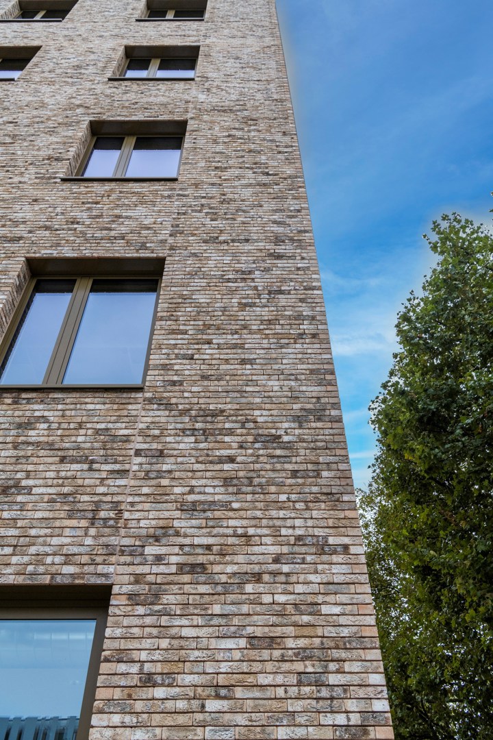 Lorsqu'on l'interroge sur les points d'amélioration possibles, Stijn Leemans répond que le choix des couleurs n’était pas encore très étoffé lors de la phase de conception. "Afin de créer un lien visuel avec les façades existantes, nous avons utilisé la variante beige moulée-main, même si je suis plutôt partisan des briques Wasserstrich ou étirées. Mais j’ai été positivement étonné par le résultat." Idem pour Jitske Pauwels. "Cela s'est mieux passé que ce que j'avais osé espérer. Le résultat final sans joints est magnifique. Le faux joint crée de beaux joints en retrait. En tant que profane, vous ne voyez même pas qu'il s'agit d'un système de superposition des briques. Pour nous, cette première expérience a été suffisamment convaincante pour envisager de recourir à ClickBrick pour de nouveaux projets.