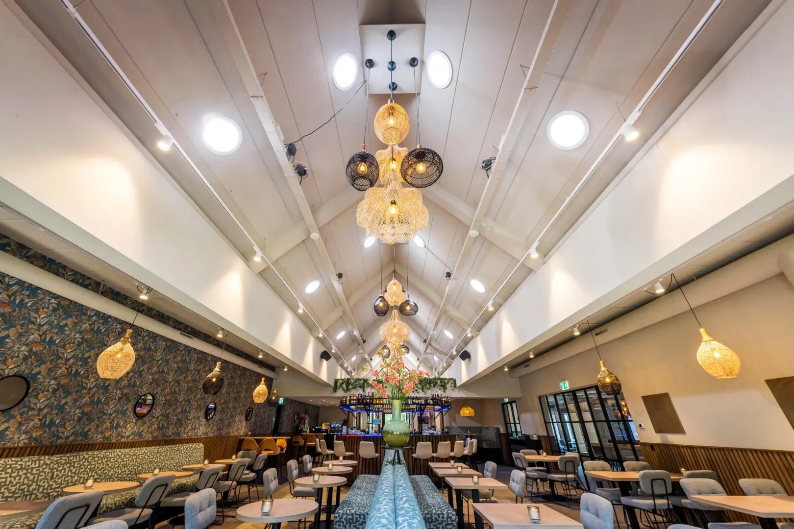 « Le restaurant devait être un lieu chaleureux et accueillant, mais aussi pratique et économe en énergie », explique Veldjesgraaf. « Avec une verrière, on est souvent confronté à la saleté, à l’éblouissement ou à la chaleur excessive. Notre système, quant à lui, nécessite peu d’entretien, se nettoie seul grâce à un revêtement spécial et diffuse une lumière douce et homogène. Ainsi, aucun risque d’éblouissement pendant le repas. »