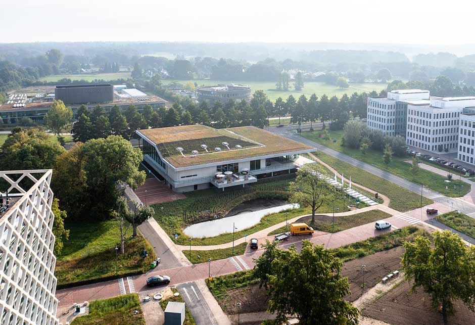 Omnia et le centre de l'université et de la recherche de Wageningen (WUR) est un bâtiment neutre en CO₂ aux Pays-Bas qui a pour ambition d’améliorer le bien-être des occupants grâce à un éclairage naturel optimisé.
