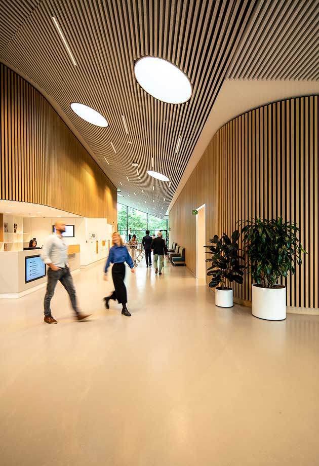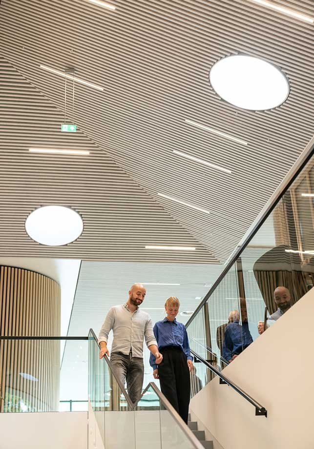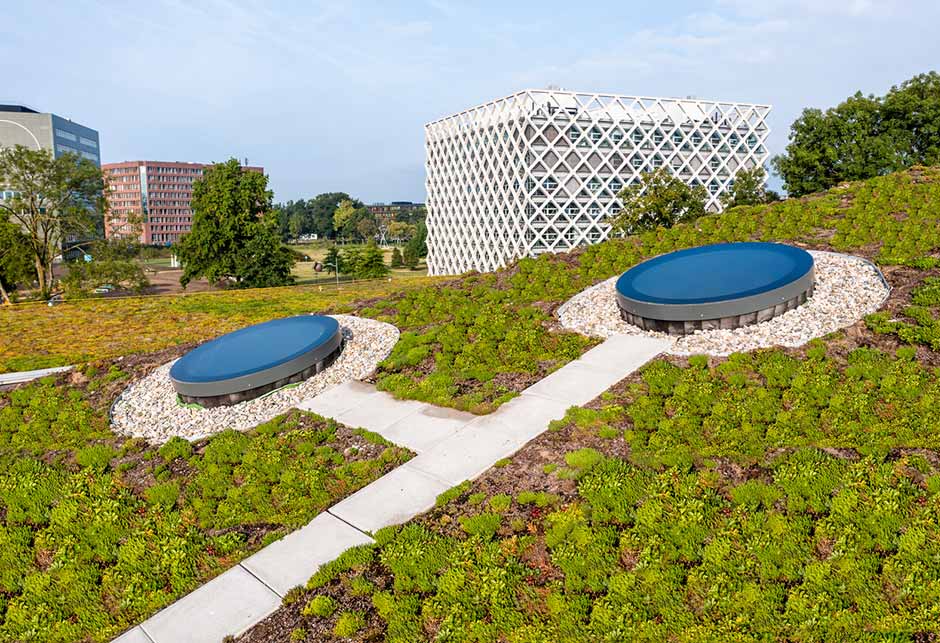 Au total, 14 Lanterneaux Circulaires aident la lumière du jour à pénétrer en profondeur dans des espaces tels que des couloirs étroits, une réception et des salles de conférence. Omnia est le lieu de rencontre idéal pour les scientifiques, les étudiants et les entreprises.