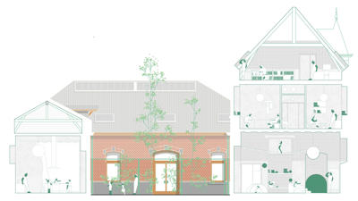 Le projet accorde aussi une attention particulière aux équipes et organisations qui feront vivre la maison. Elles bénéficient de locaux fonctionnels, mais aussi pensés pour leur bien-être mental et leur confort de travail. Plus qu’une « architecture de soin », il s’agit ici d’une « architecture soigneuse » : un environnement qui invite à prendre soin les uns des autres, y compris des accompagnants. La sécurité, le calme et la praticité sont intégrés comme éléments essentiels du cadre de vie.
