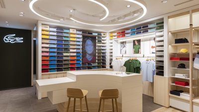 A l'intérieur, le visiteur a immédiatement l’œil attiré par le mur de polos, des étagères remplies à ras bord du vêtement le plus emblématique de Lacoste dans toutes les tailles, couleurs et coupes. Avec une superficie d'environ 150 m², le nouveau magasin abrite les différentes lignes de produits de la maison de couture française. On y trouvera notamment la célèbre collection Runway, dessinée par Louise Trotter.