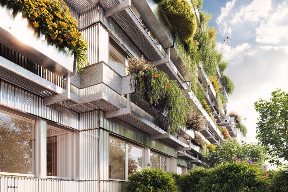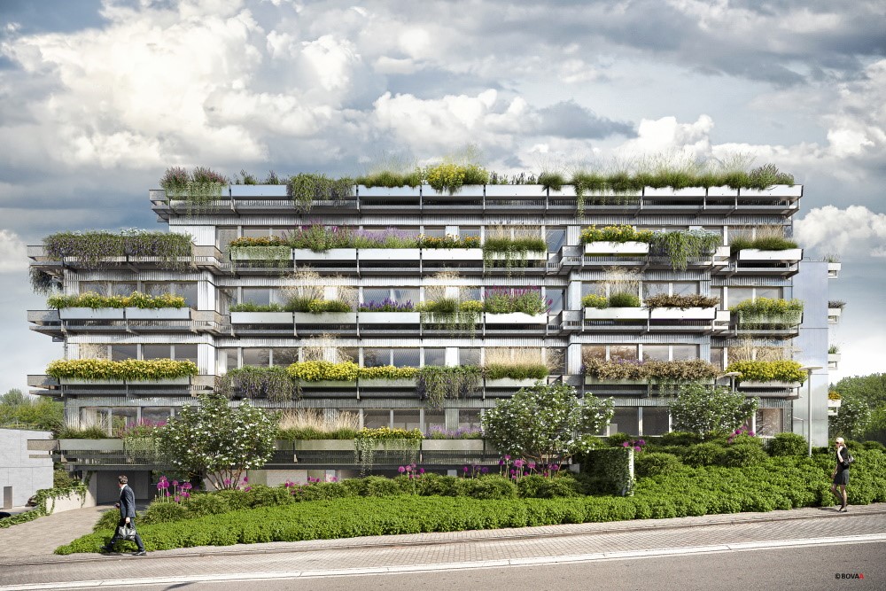 « La façade verte sera un système technologique complexe - une 'machine verte' - dans lequel nous utilisons des composants, des matériaux et des équipements mécaniques spécifiques (certains provenant d'autres secteurs industriels comme l'industrie alimentaire) afin que l'infrastructure verte puisse être gérée de manière optimale », explique Hilde Vandewalle. « Nous nous référons à la métaphore circulaire du bâtiment en tant que 'banque de matériaux' (un ensemble de différentes couches et composants qui peuvent être facilement assemblés, démontés, remplacés ou réutilisés indépendamment les uns des autres) et à l'utilisation de matériaux à longue durée de vie et efficacité. »