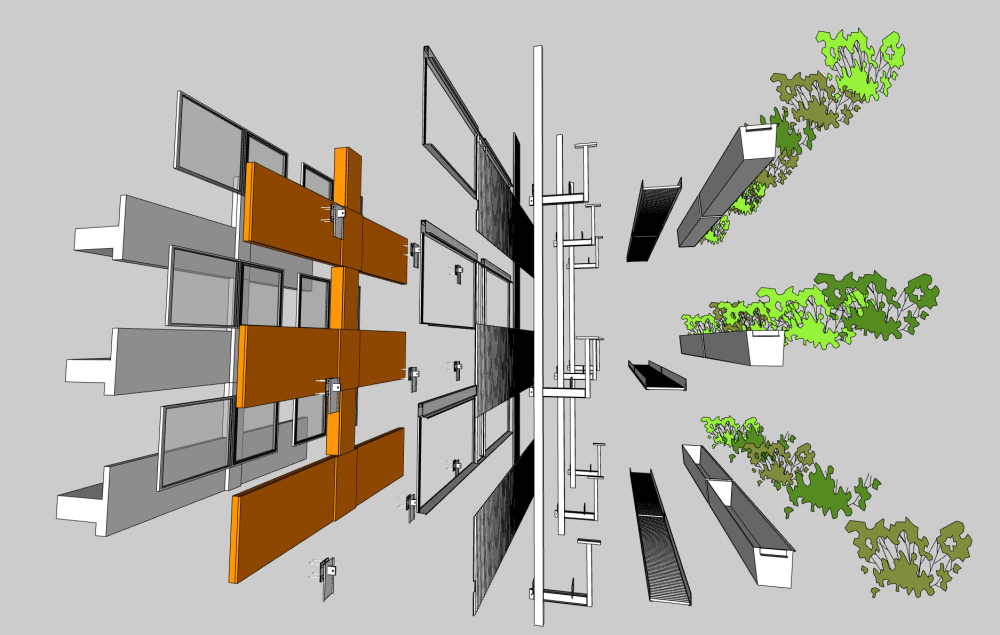 En collaboration avec Ney & Partners, la façade verte a été conçue comme une couche structurelle indépendante, une deuxième 'façade habitable' pour ainsi dire, qui ne surcharge pas verticalement la structure en béton existante avec le poids des réceptacles modulaires (les mini-jardins). En principe, un tel système peut être appliqué aux façades existantes quelles que soient leurs propriétés et leur capacité de charge.