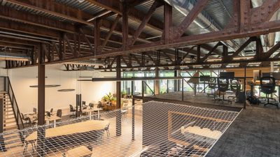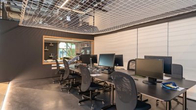 L'espace était très imposant, notamment en hauteur. « Nous l'avons divisé en différentes zones et placé trois modules duplex distincts », expliquent les architectes d'intérieur. « Une passerelle relie ces zones et nous avons délibérément omis la balustrade. C'est ce qui rend la chose excitante. Si vous tombez, vous êtes rattrapé par un gigantesque filet, qui est aussi un merveilleux endroit pour se détendre pendant ou après le travail. »