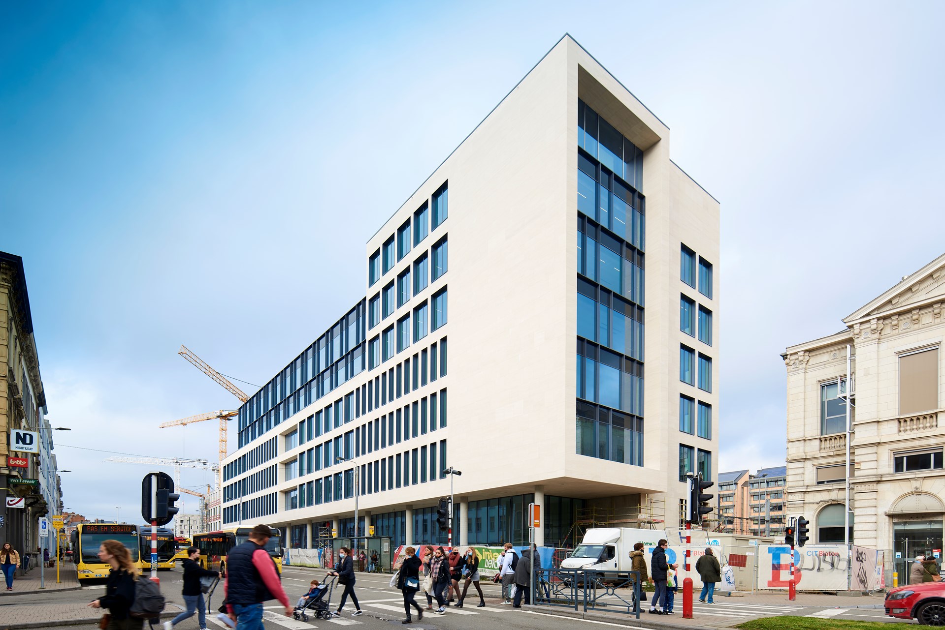 La façade est réalisée en Moca creme, une pierre calcaire portugaise que CIT Blaton a déjà mise en œuvre sur d’autres projets. « Façades, techniques spéciales et parachèvements n’ont plus de secrets pour nous, étant donné les nombreux immeubles de bureaux que nous avons déjà construits. De plus, les partenaires sur ce projet, que ce soit l’architecte ou les bureaux d’études (Pirnay pour la stabilité, VK Engineering pour les techniques, la PEB, l’acoustique et le BREEAM) ne sont pas des inconnus pour nous. »