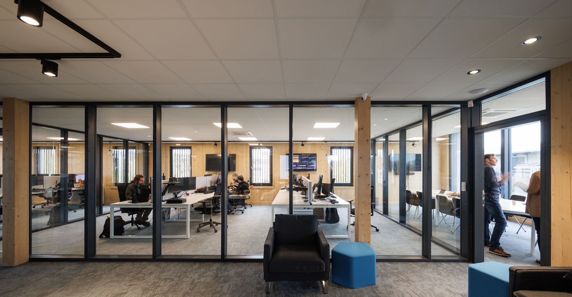 Construit à Suarlée, dans le zoning Ecolys, le bâtiment abrite une entreprise IT wallonne qui occupe 22 collaborateurs. Le bureau d’architecture Esquisse est situé à Andenne à quelques encablures, et le fabricant et constructeur bois Stabilame est à Mariembourg. Les châssis et murs intérieurs vitrés sont également fabriqués à Mariembourg, à la Menuiserie Riche. Le rayon d’action principal des éléments constructifs est donc de 85 km, ce qui constitue des circuits courts, et permet d’intégrer la notion de Made in Belgium….