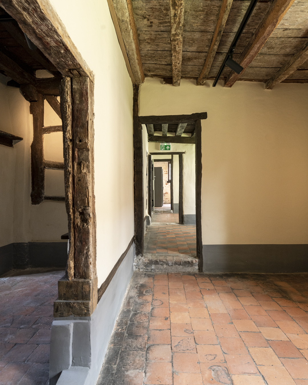 La partie la plus ancienne mise au jour par les recherches est un vestige de bâtiment à pan de bois (colombage), partiellement conservé à l’intérieur de l’aile droite (occidentale) actuelle. L’ossature de bois a pu être datée des années 1435-1460 grâce à des analyses menées à la fois en laboratoire (carbone 14) et dans les archives du béguinage. Une plus petite maison, aujourd’hui disparue et remplacée par la partie nord de l’actuelle aile gauche (orientale), fut ajoutée au bâtiment dans les années 1484-1485 (d’après les comptes). Ce dernier fut ensuite agrandi vers l’ouest au début du XVIe siècle (1511-1513), les deux bâtiments continuant d’être exploités comme lieu de vie principal des béguines jusqu’au début du XVIIIe siècle.