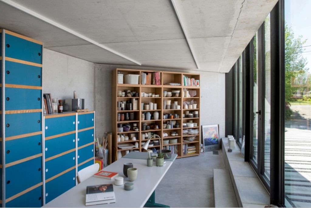 Les auteurs de projet du bureau LRArchitectes ont respecté autant que possible les dénivelés du terrain. Le volume en béton, qui héberge les pièces de vie et de nuit, semble flotter au sommet de la butte. L'accès à l'habitation est découpé dans le talus et forme un espace extérieur habillé et délimité par des murs de soutènement en béton et de la menuiserie de couleur noire. L'atelier s'ouvre latéralement sur cet espace extérieur. Le volume de l'habitation, par contre, est entièrement fermé du côté de la rue, hormis une ouverture ménagée pour abriter une terrasse. L'expression sans équivoque des volumes se retrouve également dans l'élaboration du plan d'une grande simplicité. Chacun des étages occupe une surface carrée, l'étage supérieur surplombant l'étage inférieur. Le volume trapézoïdal de l'atelier est annexé au carré inférieur.