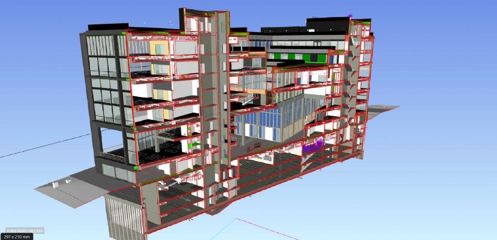 Pour Media Square, MDW Architecture et le bureau V+ ont travaillé en société momentanée avec l’entreprise Tractebel, responsable notamment de la réalisation des modèles 3D pour les structures, la stabilité et les techniques spéciales. « La principale mission consistait à être l’unique interlocuteur direct du BIM Manager du maître d’ouvrage », explique Benoît Lambert, Implementation Manager BIM chez Tractebel. « Les autres missions étaient la transmission des informations du protocole BIM aux coordinateurs BIM et leur mise en œuvre, la coordination des contributeurs, la mise en place (et le respect) du planning de production, la vérification des livrables des différentes disciplines, le contrôle de la qualité de production BIM, la gestion de la plateforme d’échange TEAM, l’archivage progressif des versions durant la phase de conception et enfin la sécurisation des données informatiques liées à la maquette. »