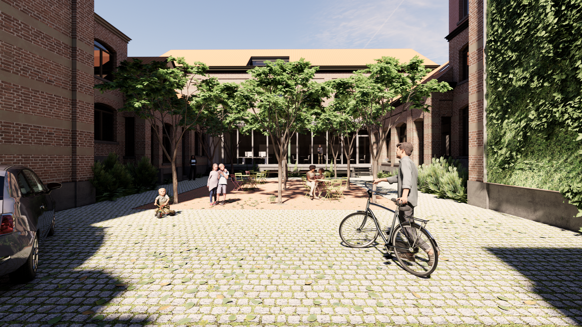 La partie intérieure partagée est accessible à la fois aux résidents des appartements et aux utilisateurs des espaces de travail et de l'atelier. En plus de deux places de parking, cette zone commune abrite également un parking à vélos.