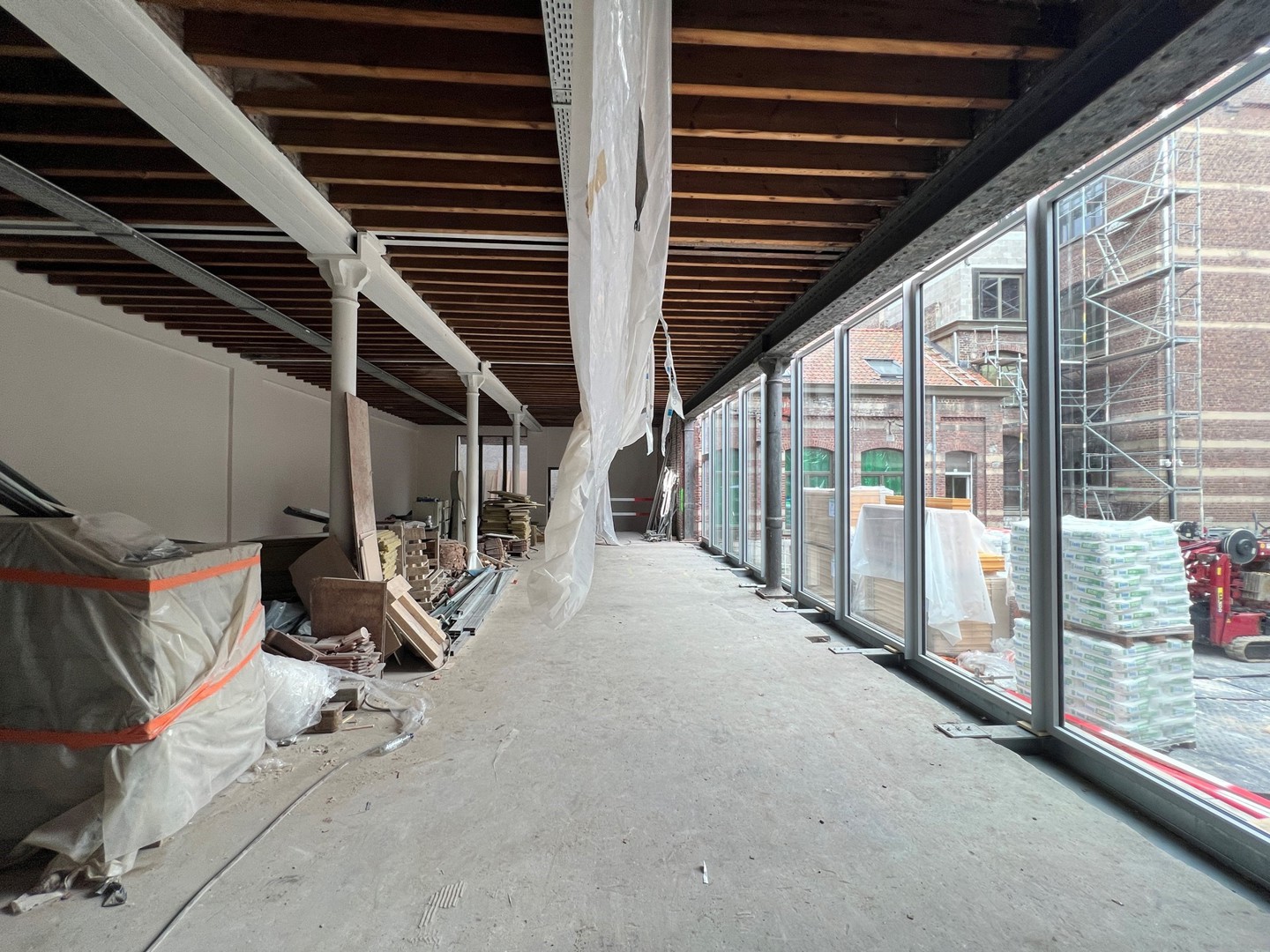 Parmi tous les matériaux existants dans le bâtiment qui ont été démolis, le potentiel de réemploi, de réutilisation et/ou de traitement a été identifié. Par conséquent, un grand nombre de matériaux provenant de la démolition ont reçu une seconde vie dans le cadre du projet, que ce soit dans leur ancienne ou dans une nouvelle fonction, après avoir été ou non nettoyés. Par exemple, des poutres en bois ont été réutilisées pour remplacer des poutres pourries ou pour fermer des ouvertures existantes, des dalles de plafond acoustiques ont reçu une nouvelle fonction d'isolation acoustique entre les poutres de plancher, et des poutres en acier - dont celles laissées par les anciens propriétaires - ont été utilisées avec des pertes de coupe minimales à des fins structurelles : pour soutenir les dalles de plancher en briques existantes, comme poutres porteuses pour les planchers existants, pour soutenir de nouvelles ouvertures dans la maçonnerie ... De même, des tuiles et des briques ont également été réutilisées.