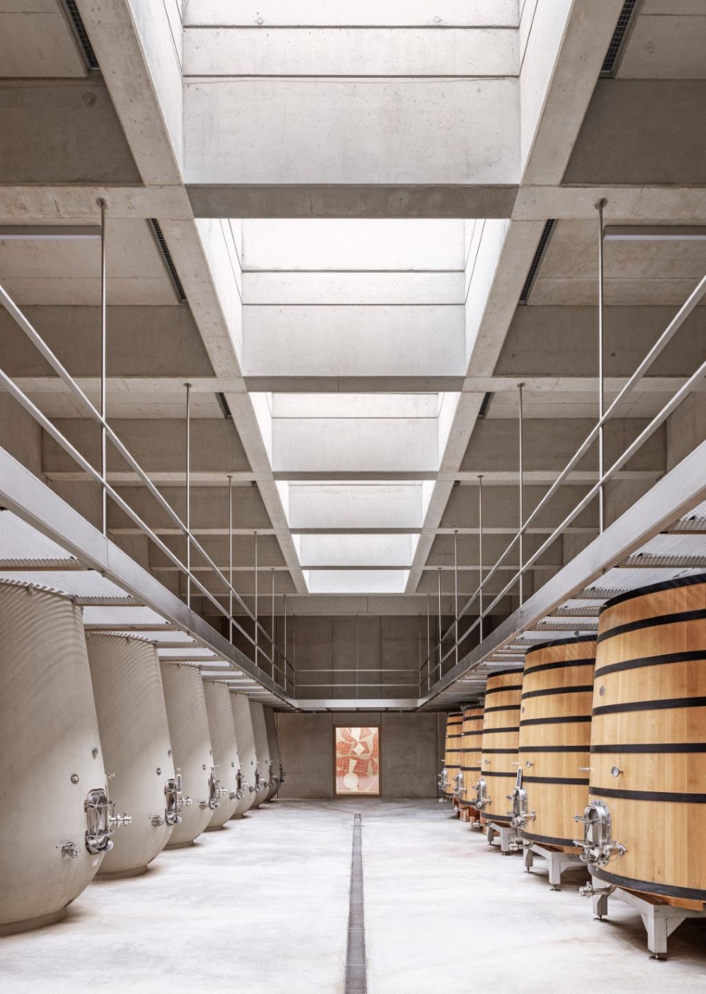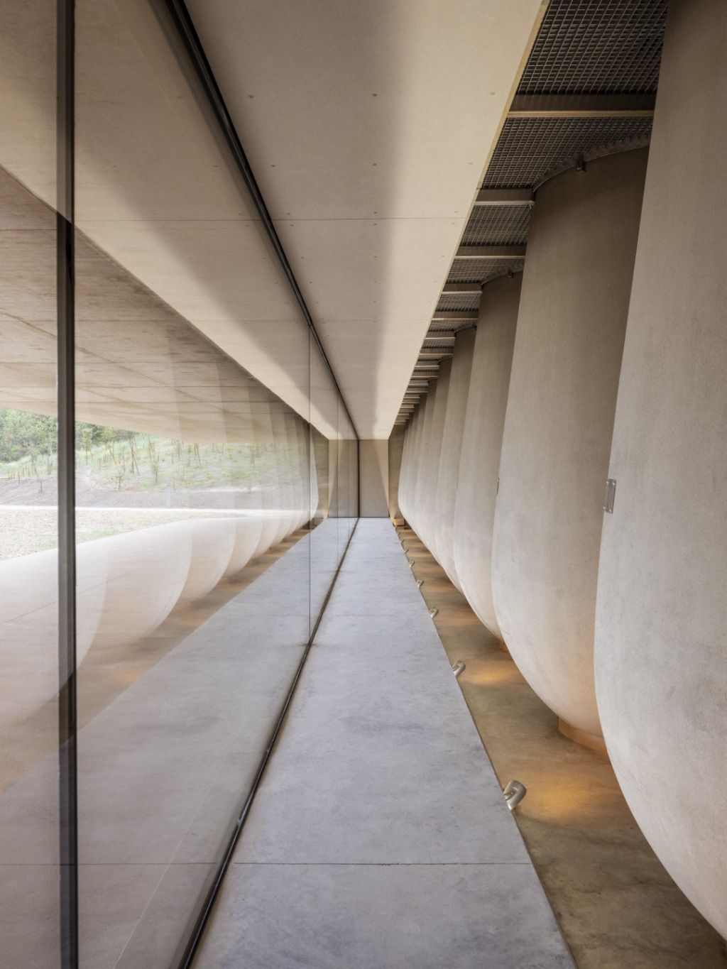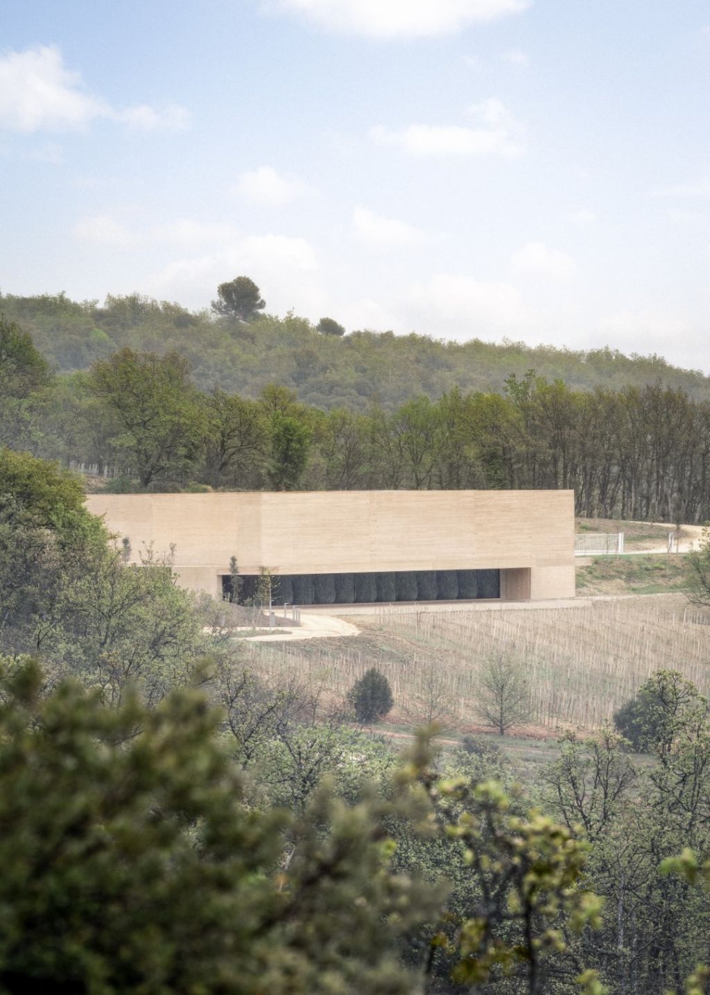 Le bâtiment, coulé en béton coffré de planchettes en bois, à l’ancienne, a été teinté dans la masse de la même couleur ocre que les terres rocheuses de la région, lui conférant une texture végétale. Sa forme, légèrement évasée, semble sortir de terre et évoque un mastaba de l’antiquité. Dès l’arrivée, on est frappé par un alignement monumental de cuves tulipes en béton que l’on distingue à travers les vitres bordant la terrasse. Cet écran panoramique aspire dans ses reflets les lignes de vignes en contrebas et rend lisible la fonction de l’édifice au premier coup d’œil.