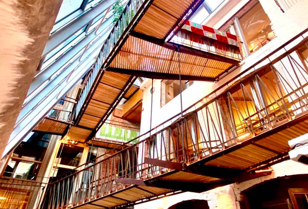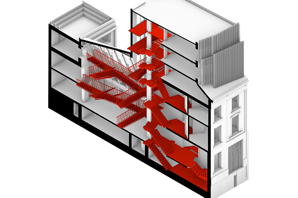 1. Garder l’essentiel de l’ancien bâtiment de commerce avec son entrée cochère et son escalier majestueux pour lui redonner son lustre d’antan, tout en libérant la cour centrale en intérieur d’îlot, phagocytée par une annexe bétonnée ;