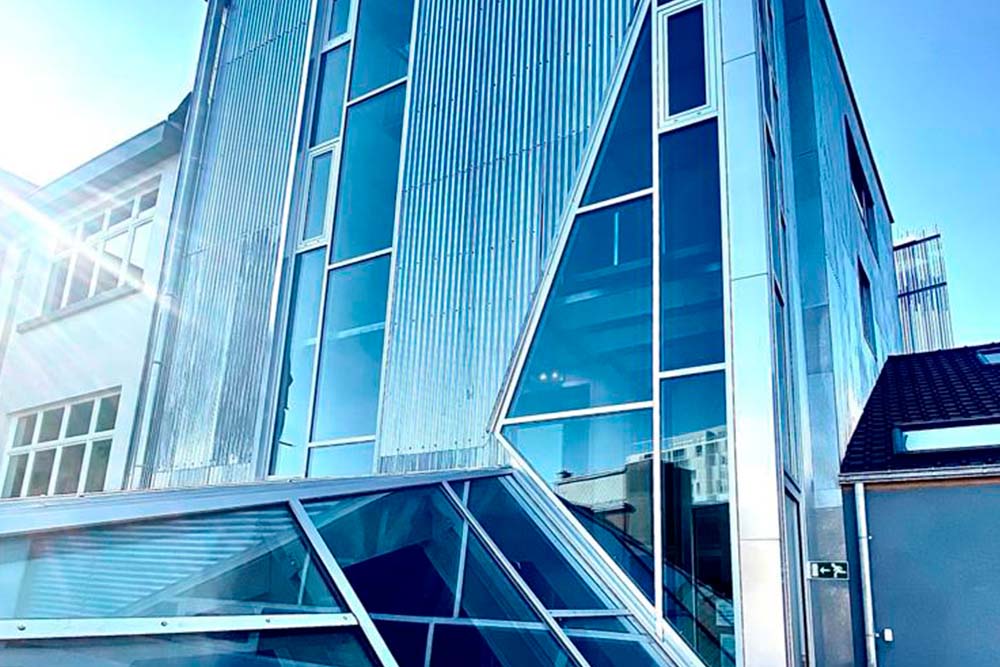 2. Augmenter la capacité du bâtiment par une optimisation des espaces en créant une rehausse phare de deux niveaux et en remplaçant les couloirs et escaliers dans les bâtiments arrières par des passerelles volant au-dessus du nouvel atrium ; Façade avant et sa réhausse phare