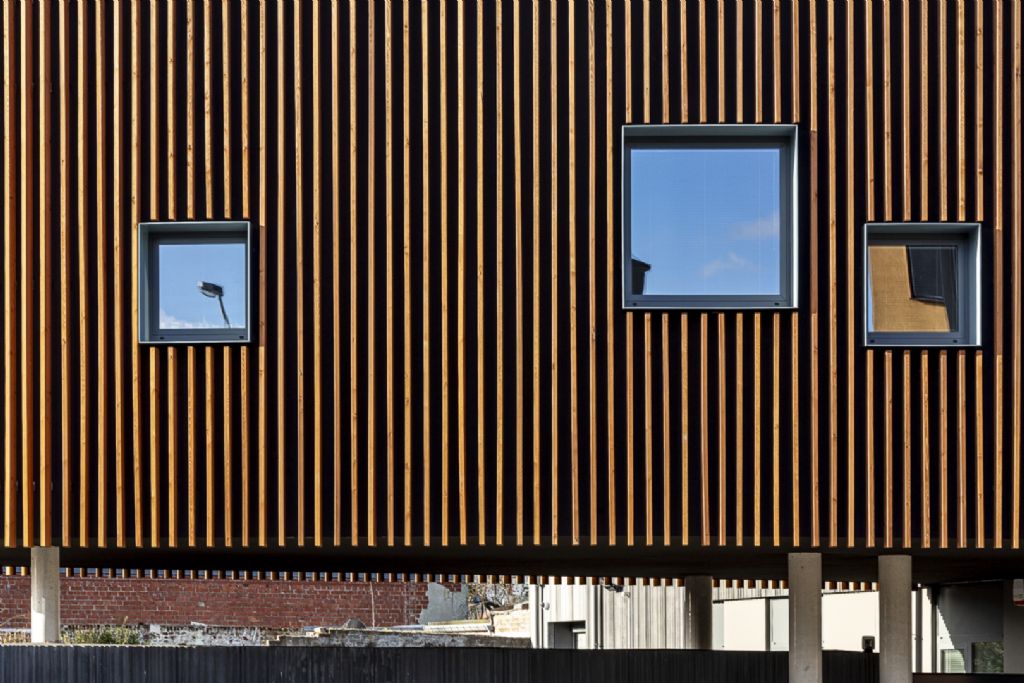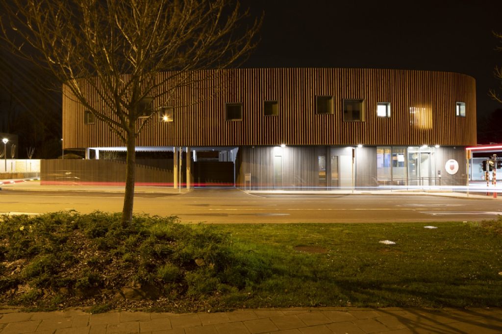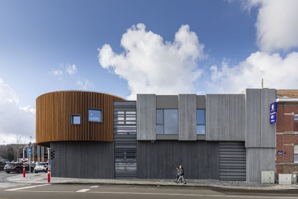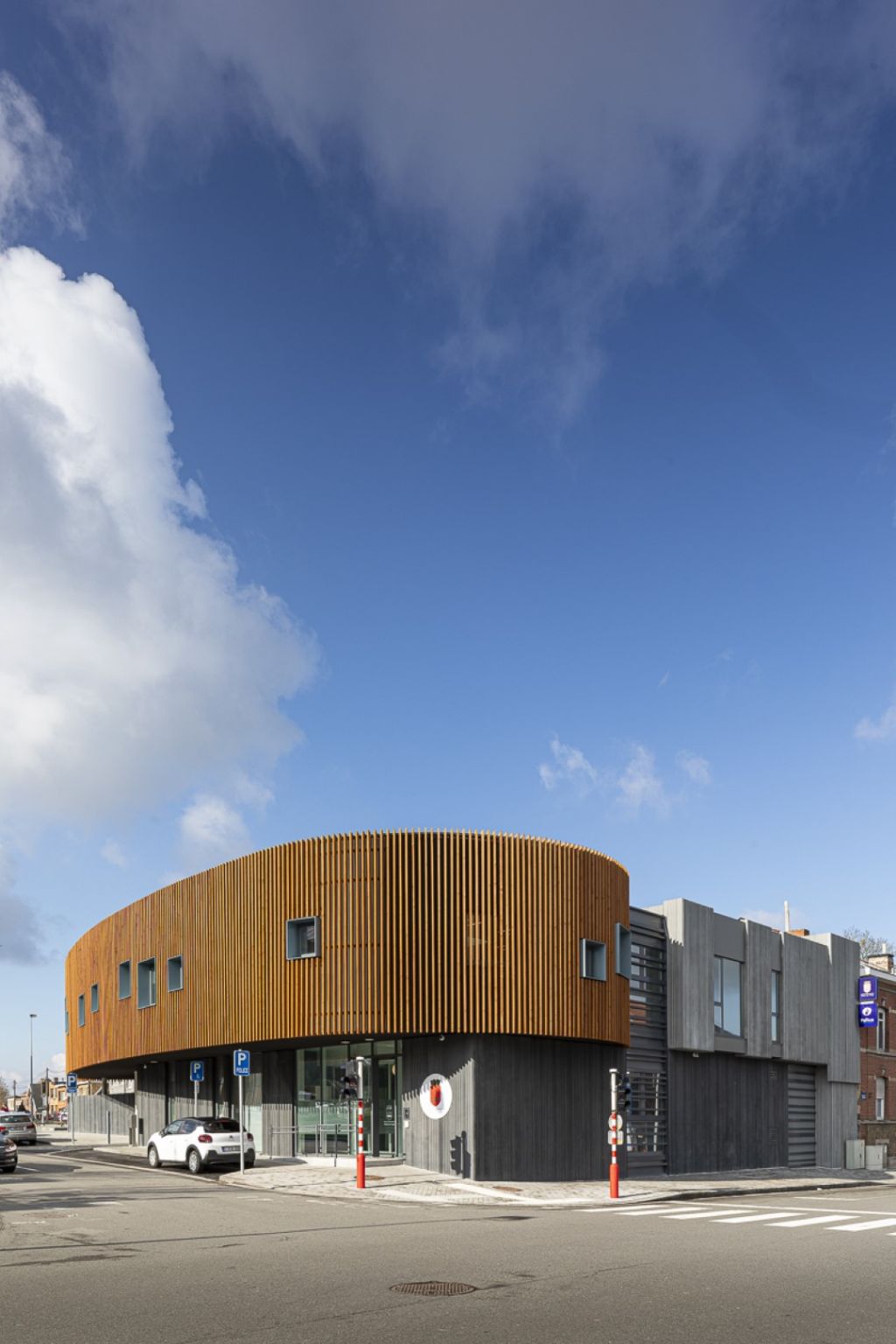 Le nouveau commissariat de quartier de Sainte-Walburge, à la jonction entre les communes de Rocourt et de Liège, est parfaitement visible depuis les nombreuses voiries environnantes mais reste néanmoins un bâtiment à échelle humaine. Le bureau d’architecture a de plus imaginé un bâtiment d’angle, permettant de définir une nouvelle lecture de l’îlot tout en s’intégrant aux habitations voisines par ces lignes de force. « L’architecture du commissariat projette à la fois une image forte, en accord avec son temps et avec sa fonction, mais également une image de souplesse et de légèreté facilitant l’intégration sociale dans le site », résument les architectes.