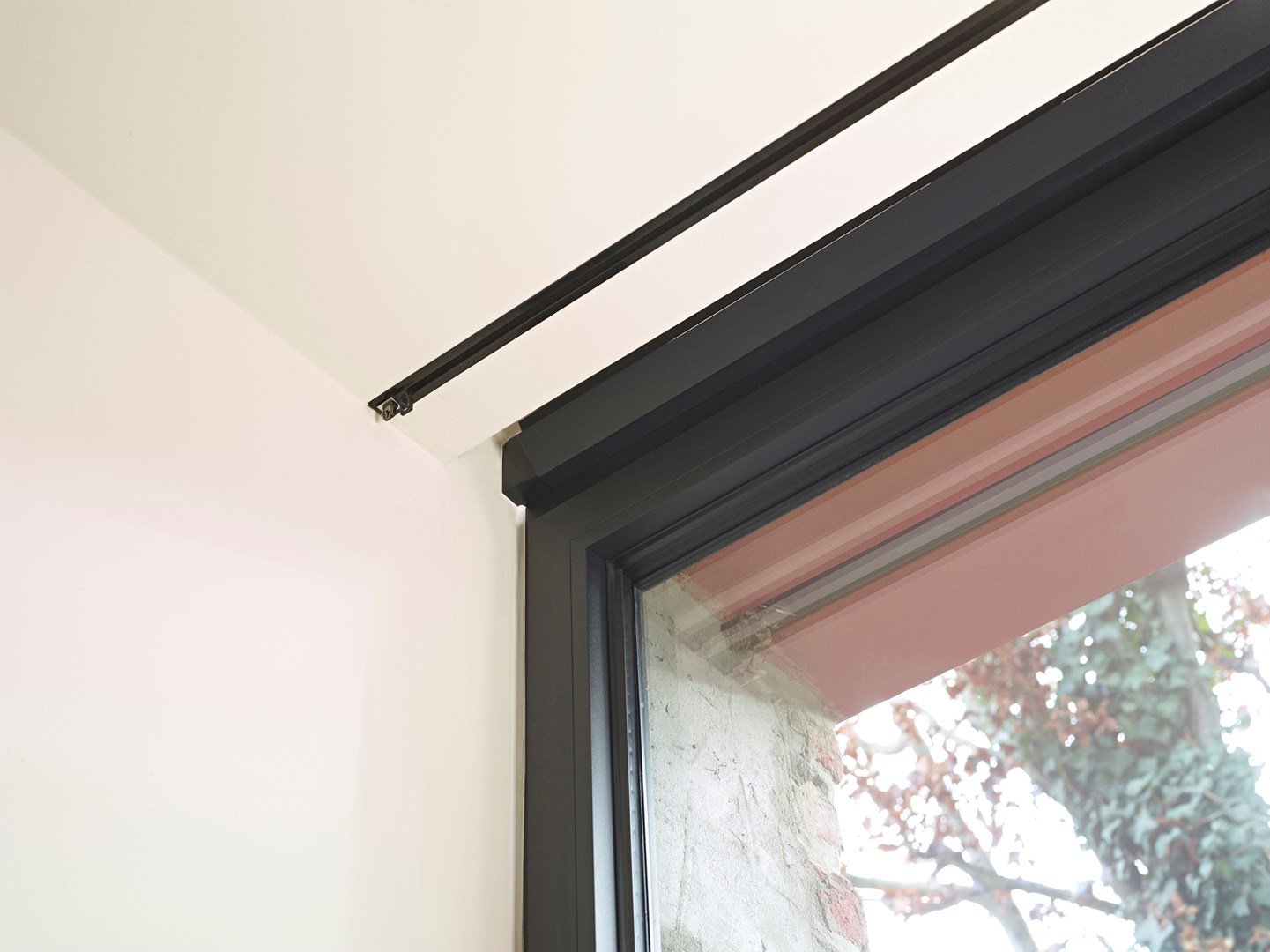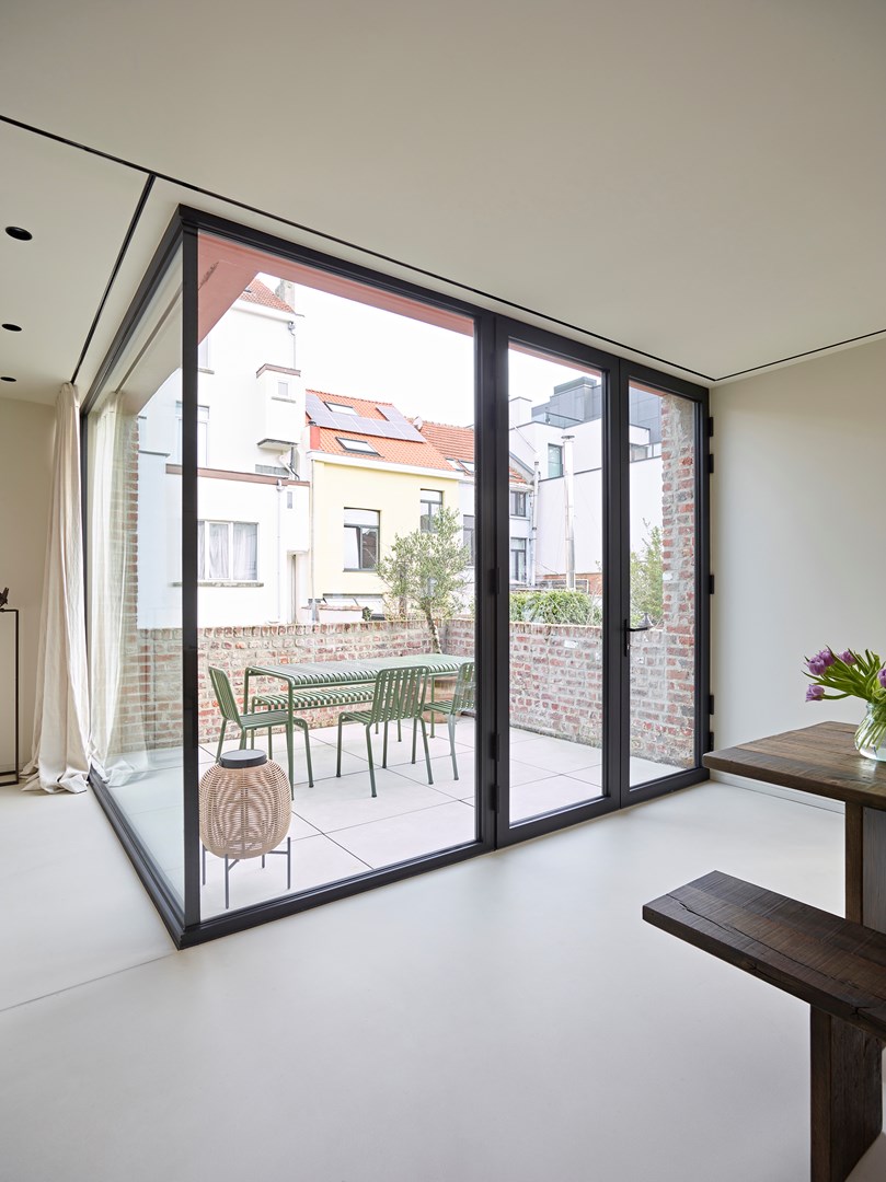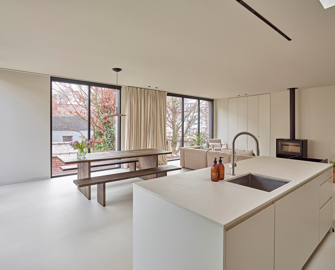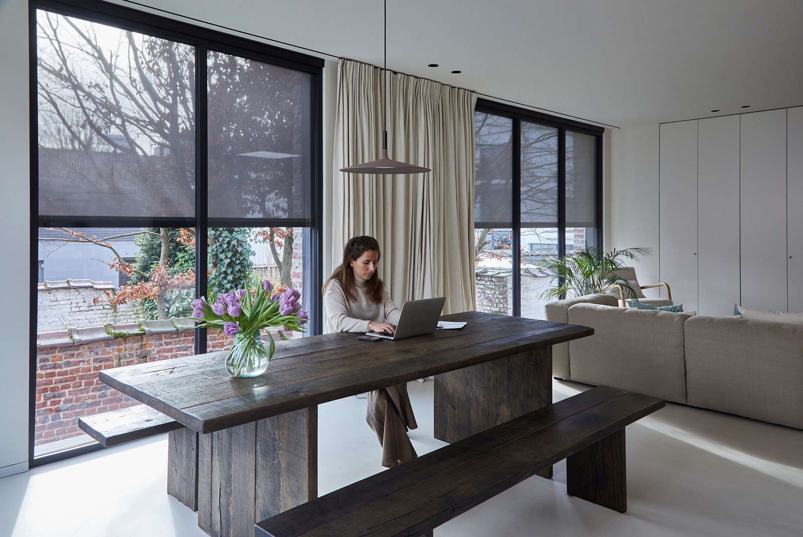De grandes fenêtres laissent entrer la lumière du jour et la chaleur du soleil. Pour éviter le phénomène de surchauffe en été, des stores de protection solaire Fixscreen ont été intégrés de manière invisible dans la façade existante. « Au plus rapidement les techniques comme les stores sont intégrées projet de rénovation, plus le résultat est réussi », analyse Laura. « L’intégration parfaite de toutes les techniques était cruciale pour arriver à ce résultat minimaliste qui crée une ambiance apaisée.»