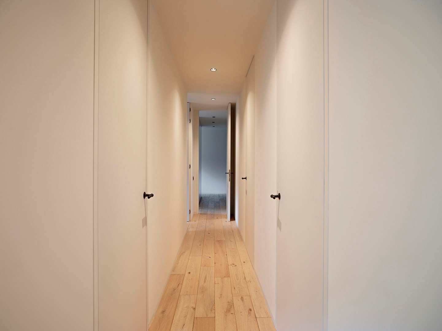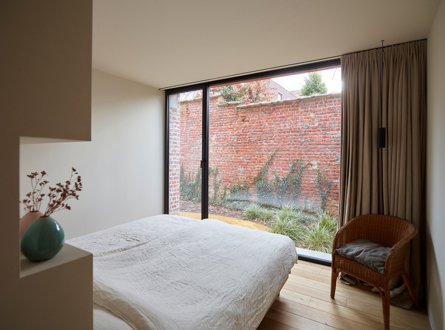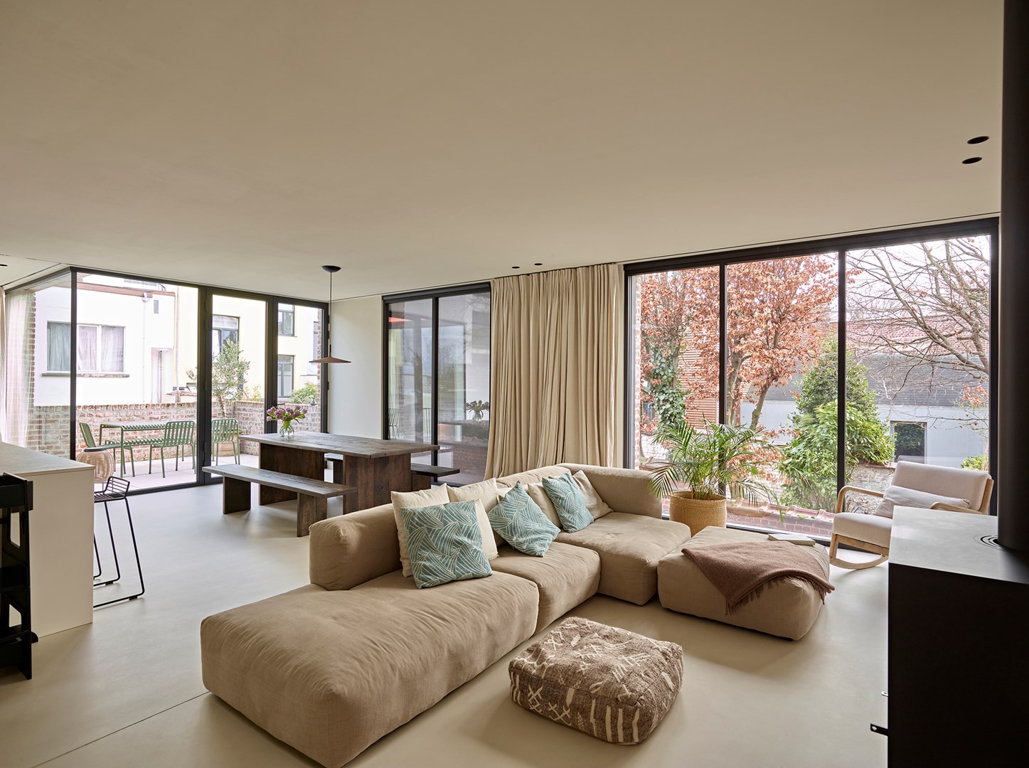 De grandes fenêtres laissent entrer la lumière du jour et la chaleur du soleil. Pour éviter le phénomène de surchauffe en été, des stores de protection solaire Fixscreen ont été intégrés de manière invisible dans la façade existante. « Au plus rapidement les techniques comme les stores sont intégrées projet de rénovation, plus le résultat est réussi », analyse Laura. « L’intégration parfaite de toutes les techniques était cruciale pour arriver à ce résultat minimaliste qui crée une ambiance apaisée.»