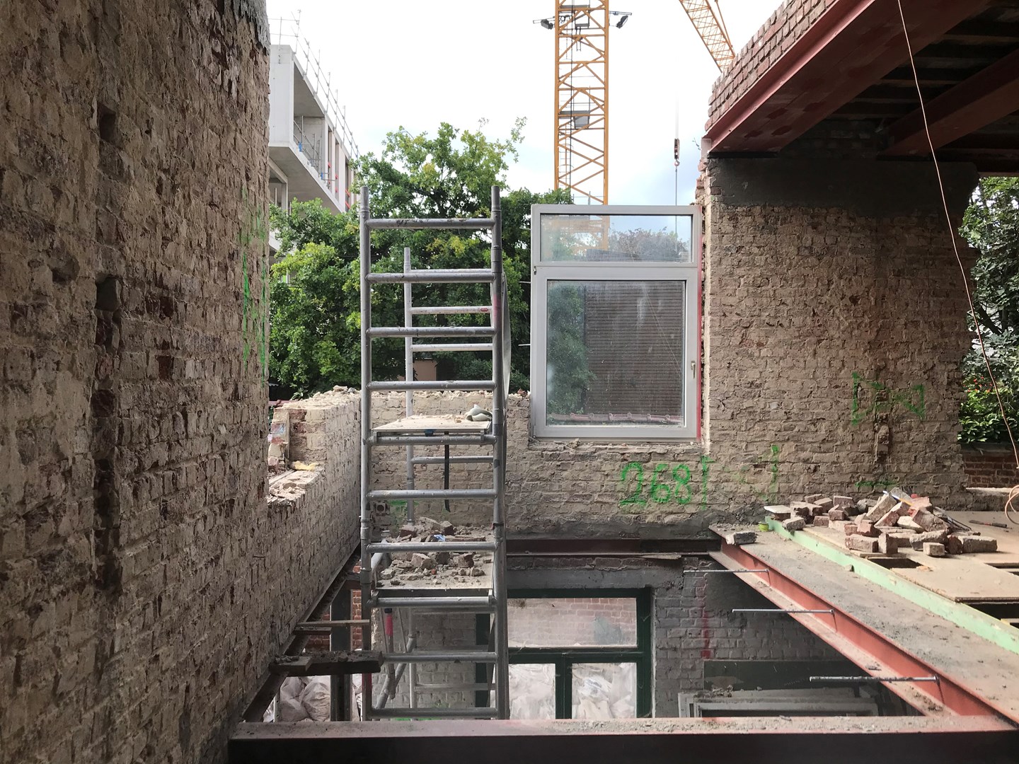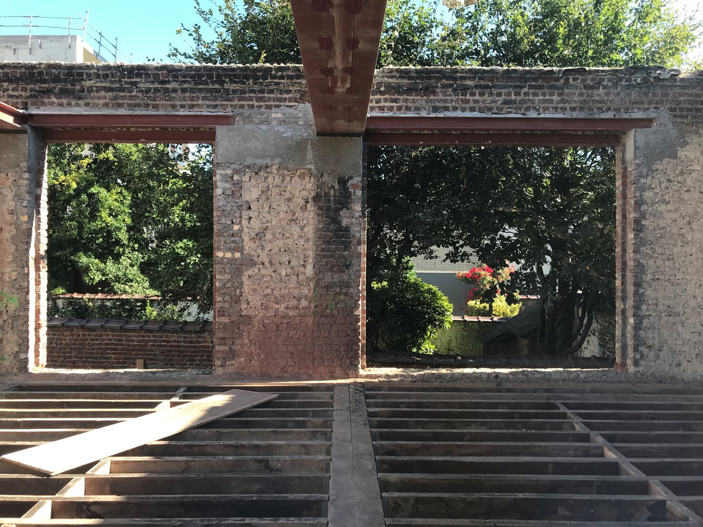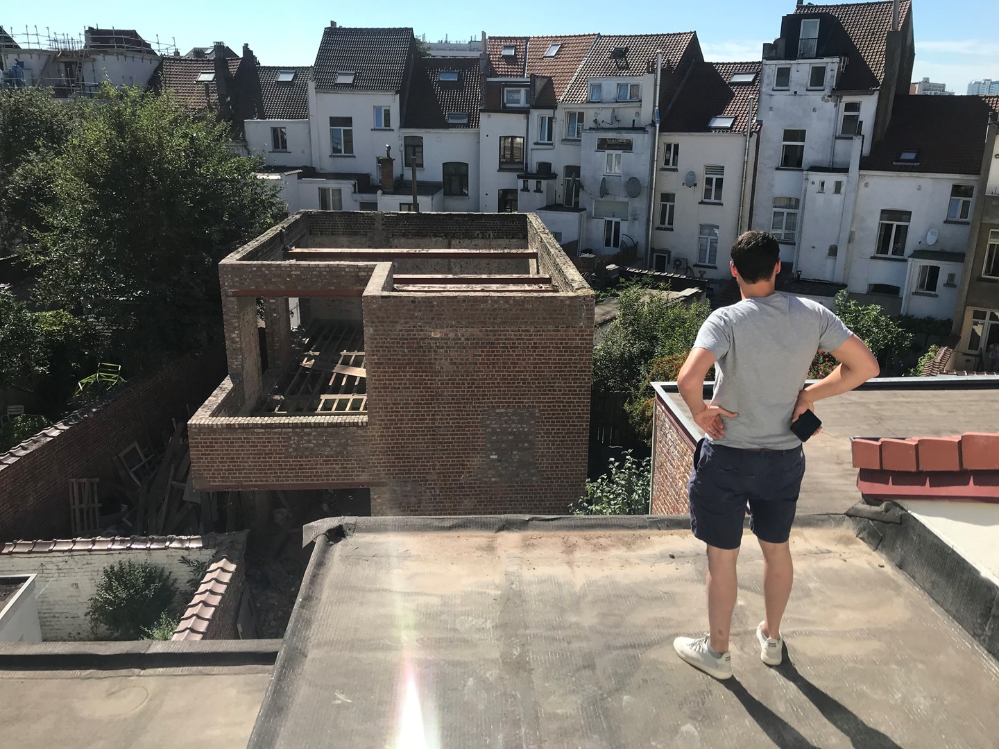 Les fondations, la dalle de sol et les quatre murs extérieurs sont tout ce qui reste de l’ancien entrepôt niché au cœur d’Etterbeek. Les parties les plus anciennes du bâtiment datent d’autour de 1800. Le risque de découvrir de mauvaises surprises était donc élevé. « De plus, cela nous a donné carte blanche pour le nouvel aménagement », souligne l’architecte Laura Hottat. « Les grandes baies vitrées du premier étage favorisent la lumière naturelle et le contact avec l’extérieur. »