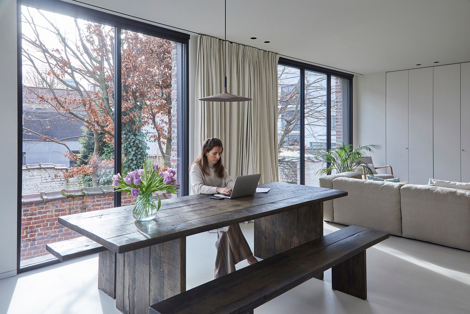 En intérieur d’îlot à Etterbeek, l’architecte Laura Hottat habite depuis trois ans dans une maison à l’ambiance zen et baignée de lumière. Grâce à une approche approfondie basée sur des techniques durables, elle a transformé un ancien entrepôt de bière en une maison unifamiliale à l’épreuve du temps. Luminosité abondante, air sain et climat intérieur stable : toute la famille en profite pleinement
