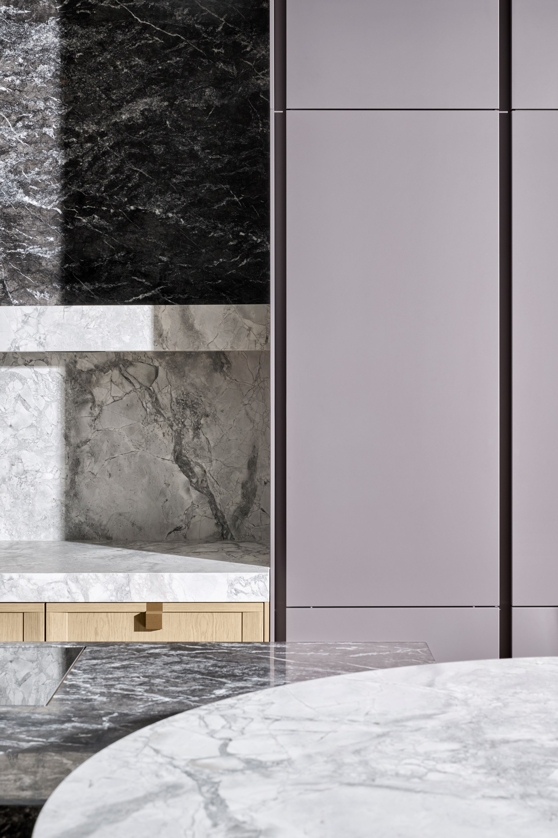 Les combinaisons des couleurs et des matériaux se retrouvent également dans les éléments de la cuisine, comme l'îlot. Ils confèrent aux équipements une nuance à la fois minimaliste et accueillante. Les formes géométriques de base sont parfaitement équilibrées avec des touches raffinées et des éléments robustes dominants.