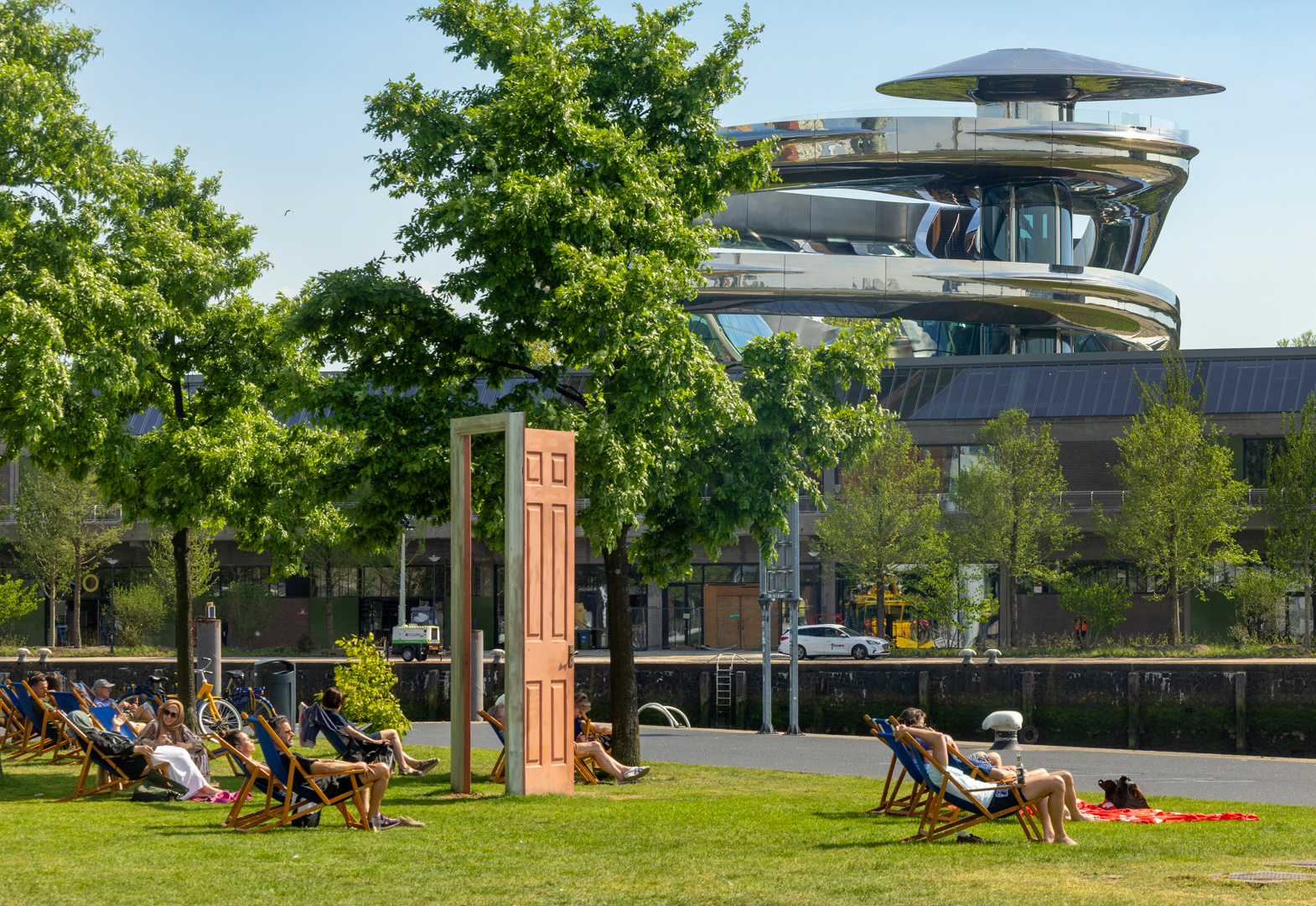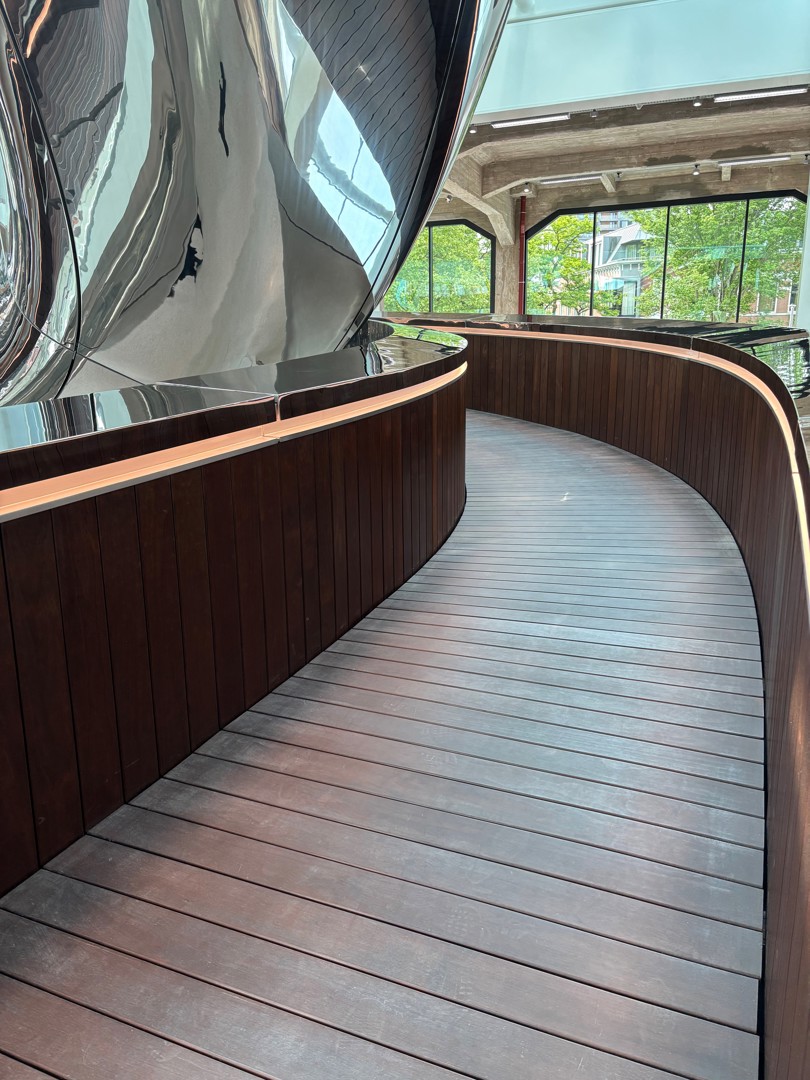 Développée en Norvège, la technologie Kebony® est un procédé breveté et respectueux de l’environnement, qui modifie le bois résineux issu de sources durables en l’imprégnant d’un liquide biosourcé d’origine organique. Grâce à la polymérisation de la paroi cellulaire, le bois acquiert de façon permanente les caractéristiques du bois tropical, tout en minimisant l’impact écologique. Sa teinte naturelle brun chaud évolue avec le temps vers une patine gris argentée raffinée, en parfaite harmonie avec les reflets de l’acier et les nuances du ciel néerlandais.