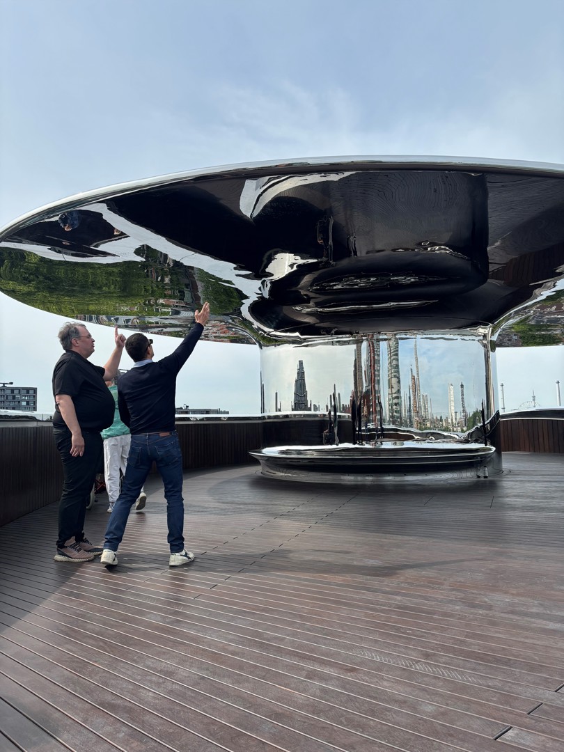 Au cœur du Tornado se déploie un monumental double escalier en colimaçon menant les visiteurs vers une plateforme d’observation perchée à 24 mètres de hauteur, semblant flotter au-dessus de la ville. Tandis que l’extérieur brille de son acier inoxydable poli, l’intérieur révèle un escalier aux garde-corps entièrement réalisés en bois Kebony. Les 297 panneaux extérieurs, nécessitant chacun près de 100 heures de polissage, reflètent le ciel et confèrent au lieu une dimension contemporaine et surréaliste. Les 12.500 planches de Kebony Clear, toutes uniques et dotées d’un QR code pour un éventuel remplacement, insufflent une dynamique de mouvement.