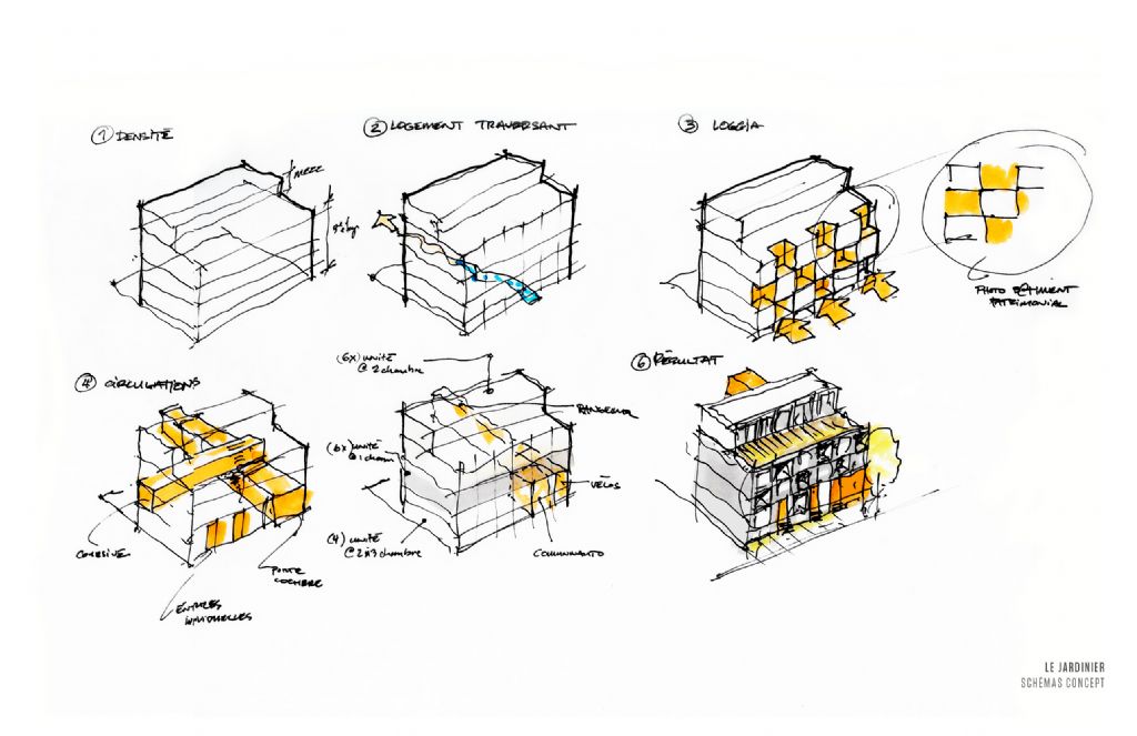 Guidé par une idée dominante d’ouverture, le bâtiment a été conçu de sorte à ce que chaque logement soit traversant. Ainsi toutes les unités bénéficient d’une ouverture à l’arrière comme à l’avant, avec une loggia d’un côté ou de l’autre. La disposition de ces appartements offre alors, en façade comme sur la cour, un agréable dynamisme grâce à un jeu de décalage en plan des unités. Ces loggias permettent, en fin de compte, la création d’espaces privés et isolées acoustiquement les uns des autres, tels des cocons à la fois intime et aérés. A l’intérieur, la qualité des appartements va bénéficier de cette pensée fondatrice, puisque cette transversalité permet aux résidents de bénéficier d’une luminosité constante tout au long de la journée. Les unités du dernier étage, quant à elles, disposent d’une mezzanine donnant sur des terrasses dont l’horizon dégagé offre une vue imprenable jusqu’au pont Jacques Cartier.