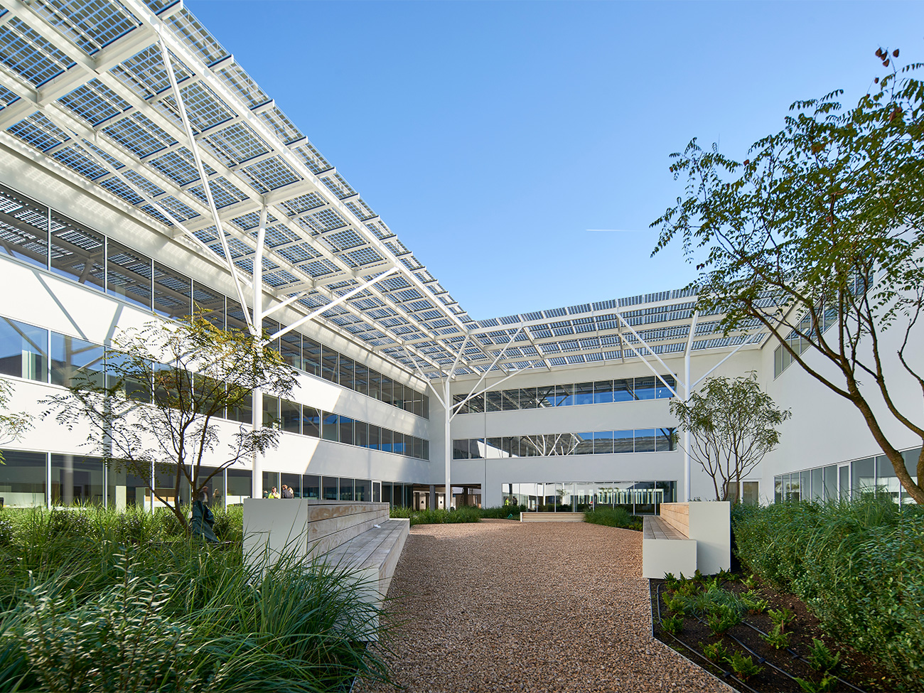 Au-delà de son aspect fonctionnel, le complexe a également été conçu dans le but d’offrir un cadre agréable : les deux bâtiments, reliés par des passerelles couvertes aux étages, sont dotés de plusieurs larges patios verts et arborés, qui favorisant les rencontres et le partage et apportent également de la lumière naturelle. Cet axe de circulation central peut être considéré comme le centre névralgique du site, qui fait également part belle aux espaces verts, avec près de 8000 m² de couverture végétale.