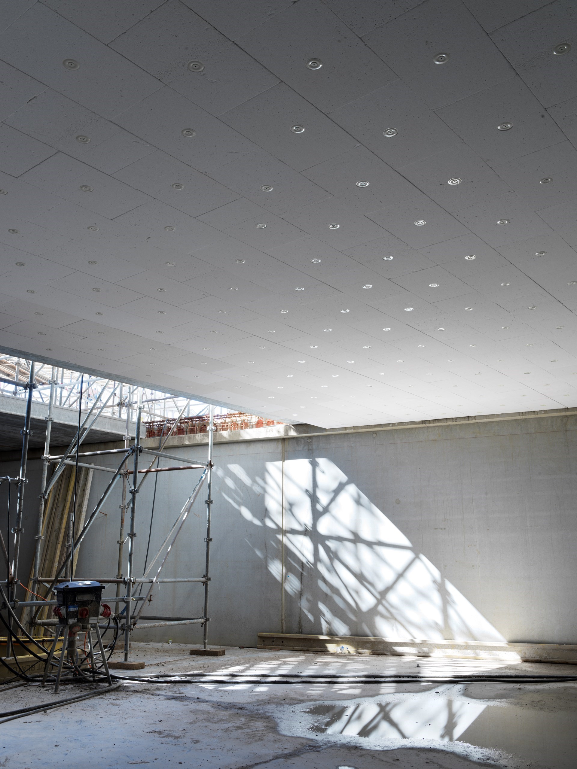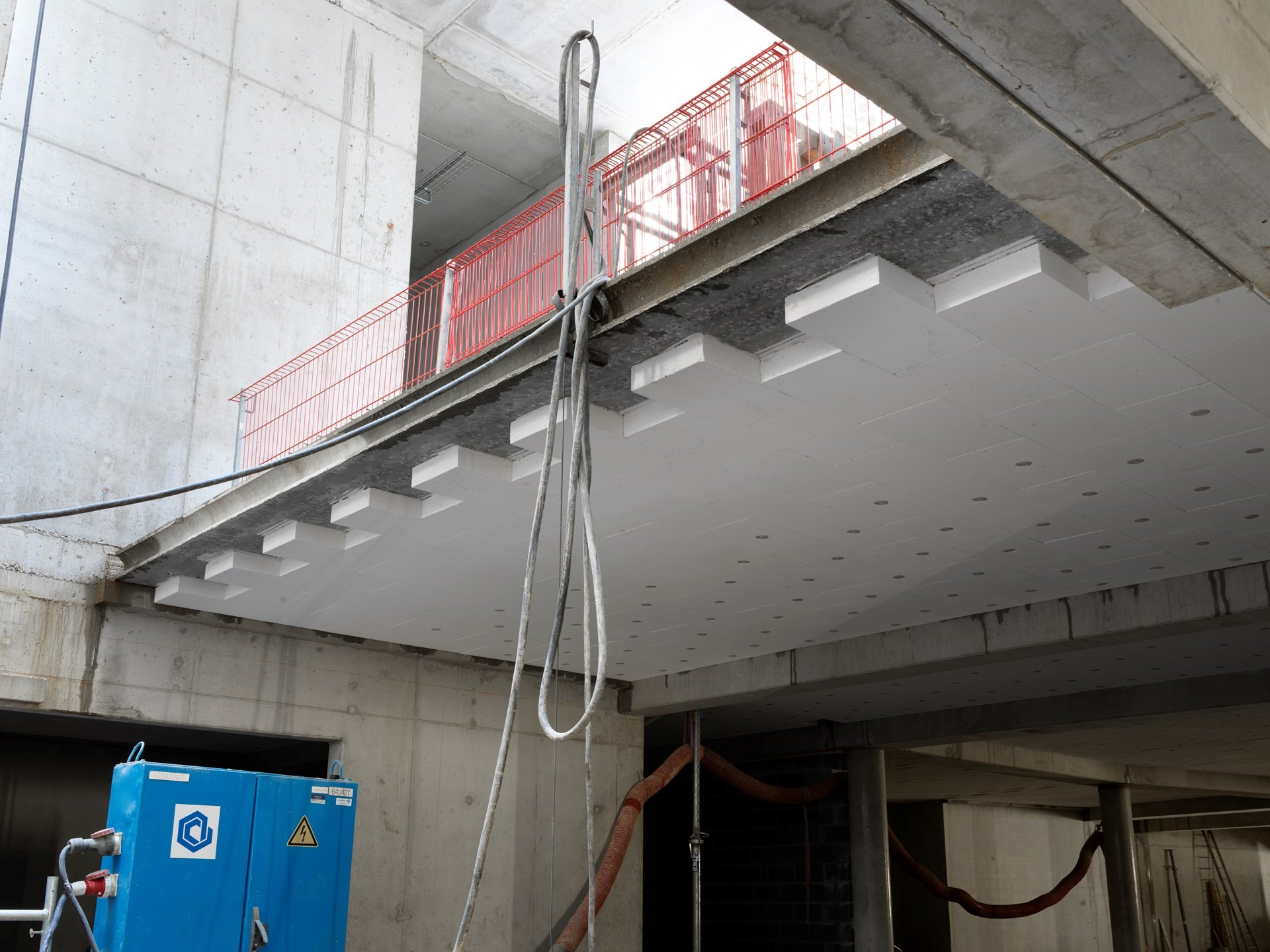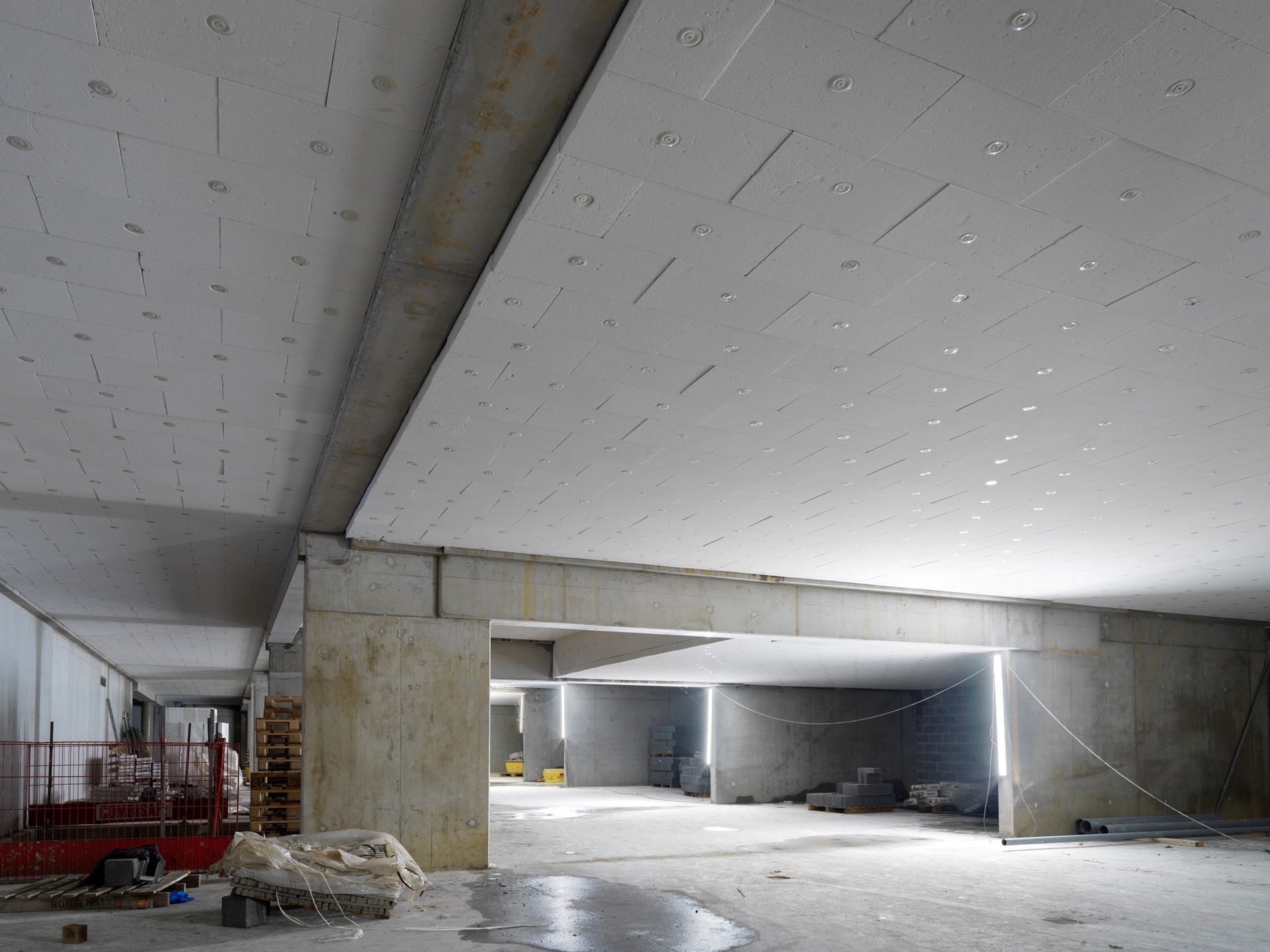 Pour le projet du Palais de Justice de Namur, les architectes ont eu recours aux panneaux Multipor pour réaliser l’isolation des plafonds de parking, et ainsi renforcer les performances énergétiques du bâtiment par le sol. La chaleur au sein du bâtiment ne s’échappe pas et, coup double, les nuisances sonores relatives aux voitures se déplaçant dans le parking sont fortement réduites, participant ainsi à un plus grand confort pour les utilisateurs du Palais. Cet amortissement acoustique, dû à sa structure cellulaire, est un des avantages du Multipor par rapport à d’autres isolants.