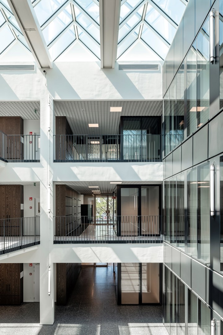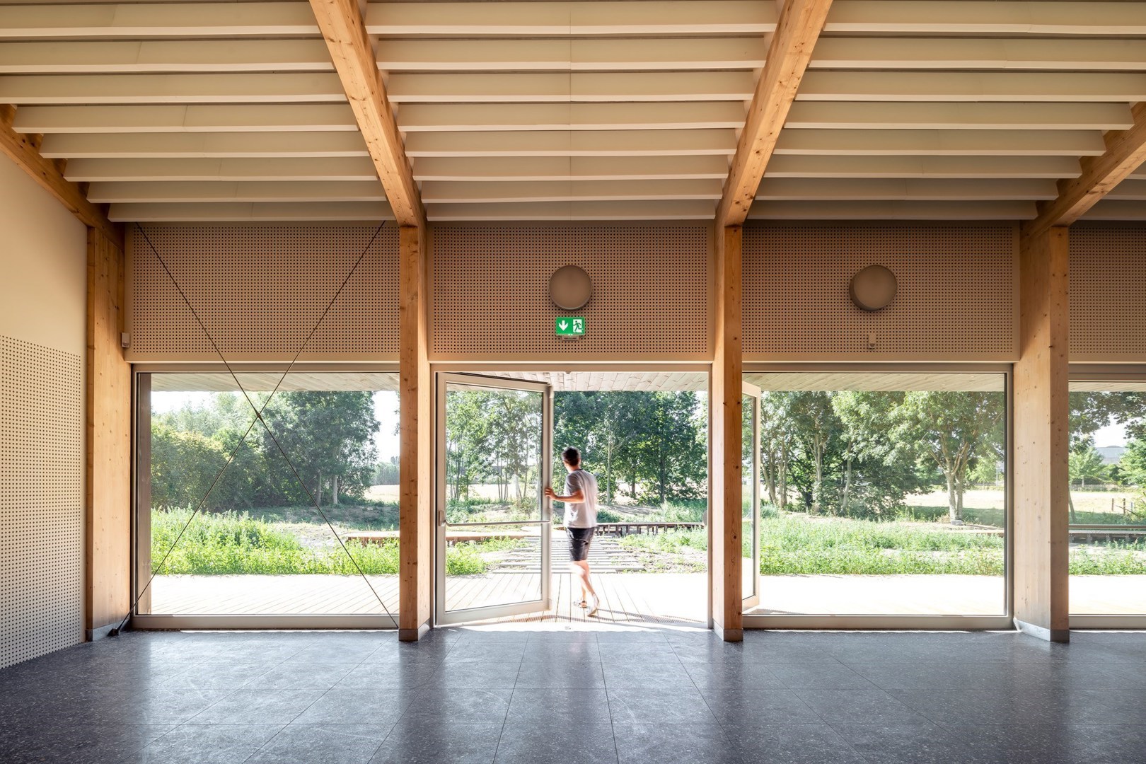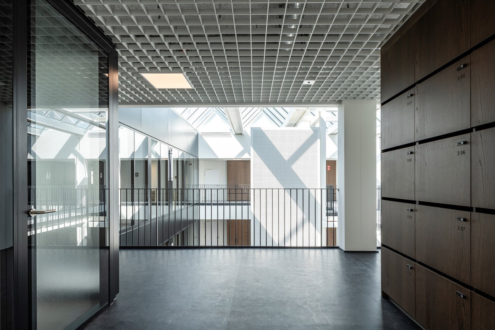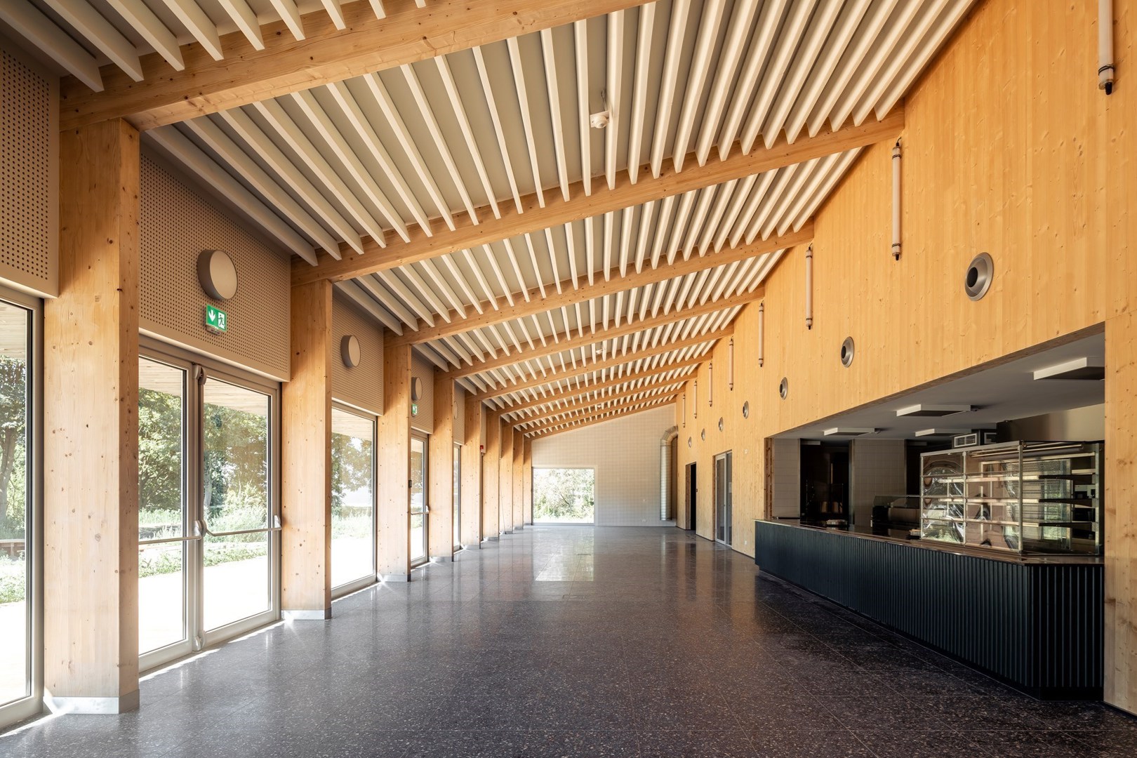 De plus, l'équipe de conception s'est également focalisée sur les principes de la construction circulaire, en commençant par le réemploi. L'équipe pouvait également compter sur l'entrepreneur Van Roey, qui avait déjà une certaine expérience dans le domaine de la réutilisation des matériaux. Par exemple, le revêtement de sol du bâtiment existant, la pierre bleue, a été réutilisé dans le pavillon du réfectoire, tout comme les baffles acoustiques des bureaux d’architecture paysagiste existants. Un certain nombre d'éviers en porcelaine, de cuvettes de toilettes, d'urinoirs et même de leurs cloisons de séparation connaissent une seconde vie dans le nouveau bâtiment. Le mobilier existant a quant à lui été remis à neuf.