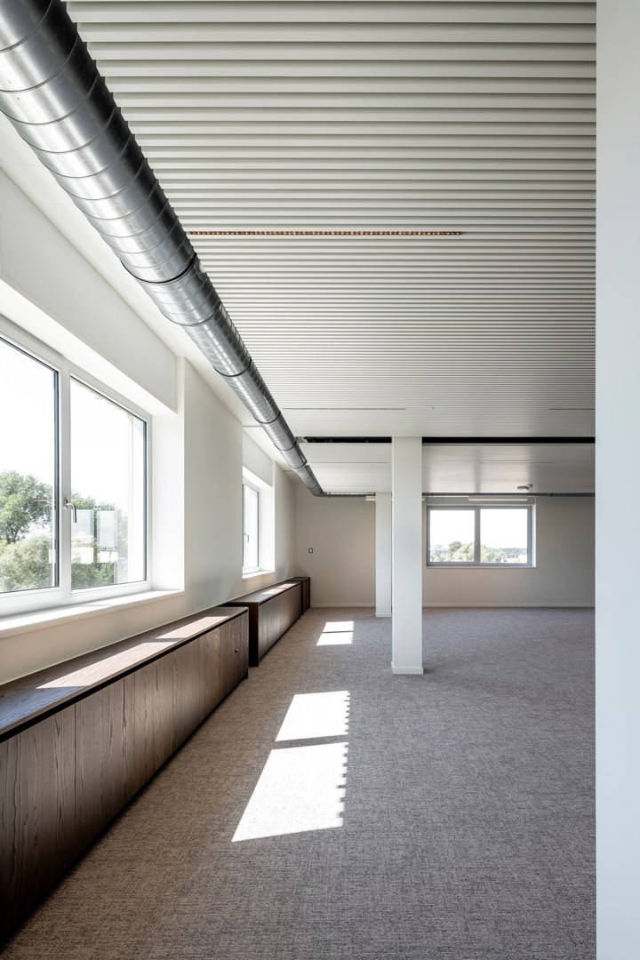 La chaleur des eaux usées est utilisée pour chauffer et refroidir le bâtiment. Concrètement, la chaleur et le froid sont récupérés à partir des eaux usées via un échangeur de chaleur pour atteindre le climat intérieur du bâtiment souhaité. Les éléments de chauffage et de refroidissement sont cachés dans le plafond climatique sous-baissé. Ce dernier peut d’ailleurs être considéré comme circulaire car il est adapté au bâtiment existant tout en laissant la possibilité de modifications futures.