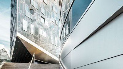 « La façade fragmentée se compose de 7 000 pièces », raconte Frank Ludin. « Pourtant, malgré cette fragmentation, la tour est perçue comme un monolithe », souligne Kathrin Aste. Détail intéressant : les différents niveaux du bâtiment ne sont pas visibles de l’extérieur. En dépit de son important volume — quelques 100 000 m³ pour une superficie totale de 25 000 m² —, la construction échappe à la massivité oppressante qui émane si souvent des bâtiments de cette taille. Elle donne au contraire une impression de légèreté que l’on doit principalement au choix des matériaux. « Le verre et le métal sont particulièrement intéressants pour les projets de grande envergure. Leur réflectance donne vie au bâtiment. Ces deux matériaux changent au cours de la journée et au fil des saisons. La construction resplendit ainsi toujours de mille couleurs différentes », explique Kathrin Aste.