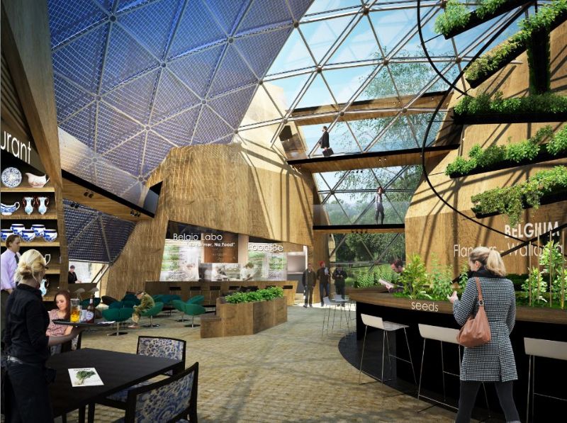 Dès le Decumanus − axe principal de circulation de l’Expo le long duquel s’organisent les différents pavillons − une Piazza multifonctionnelle attirera les visiteurs. Cet espace à l’air libre animé d’un grand écran Led, et aménagée de gradins en bois, permettra d’imaginer une multitude de scénarios de jour ou de nuit. Après avoir franchi l’espace d’accueil semi-couvert, le visiteur pénètrera dans le grand volume diaphane de la ferme baigné de lumière naturelle et tamisée par une mosaïque d´écrans qui envelopperont littéralement le visiteur. Cette première zone située dans la Ferme a pour objectif de dresser un portrait actuel et séduisant de la Belgique. Le visiteur sera attiré depuis l’extérieur à entrer dans le pavillon, il découvrira, à travers l’espace Food.be « Small Country, Great Food », les principaux produits belges de grande qualité et de renommée mondiale (le chocolat, la bière, la pomme de terre…) ainsi que d’autres richesses de notre industrie alimentaire. On trouvera aussi un clin d´œil destiné à la grande majorité des visiteurs italiens en présentant des personnalités belges célèbres d’origine italienne. Une « rampe du futur » avec des animations lumineuses plongera sous terre, et fera faire au visiteur un bond dans le temps (un marquage au sol accompagne de 2015 à 2050), expliquant les possibles innovations pour l’évolution de la planète : c’est une phase de prise de conscience des enjeux de la planète pour demain. La rampe débouchera dans un sous-sol artificiel, la Cave, qui sera informative et plongera le public dans une ambiance de pénombre. Un escalier de verre, inondé de lumière zénithale, se déploiera, tel l’ADN, en double hélices de plantes, dans le grand espace du dôme géodésique. Le visiteur débouchera alors au cœur du Pavillon, dans l’atrium, un espace fluide aux multiples fonctions intégrées autours du thème de la consommation. C’est l’espace de la jouissance, des saveurs, des odeurs, du goût, de la « convivialité à la belge » qui charmera le public. La consommation de nourriture devient alors partie intégrante de l’Expo avec différents types d’expériences.