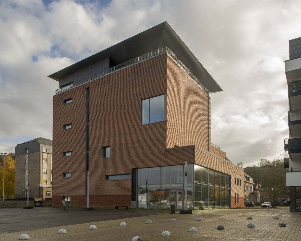 Le nouvel équipement, regroupement d’une série de fonctions culturelles et de l’Office du tourisme, se situe en bout de perspective de la Promenade des Ours, nouvellement créée, qui le relie à la Grand Place. Gil Honoré : « Nous voulions manifester la présence du bâtiment existant, et de sa piscine en particulier, malgré l’adjonction d’espaces complémentaires nécessaires pour rencontrer le programme. Nous avons donc fait apparaitre la paroi courbe qui enclos l’espace de la piscine en ouvrant fortement l’angle du bâtiment. Celle-ci est elle-même percée, ce qui crée une profondeur de champ qui permet de percevoir le volume de la piscine depuis l’entrée. Nous avons habillé cette paroi courbe, sur l’extrados, de mosaïques noires de petits formats, surface pixellisée qui renvoie tant la lumière que les reflets de l’extérieur.