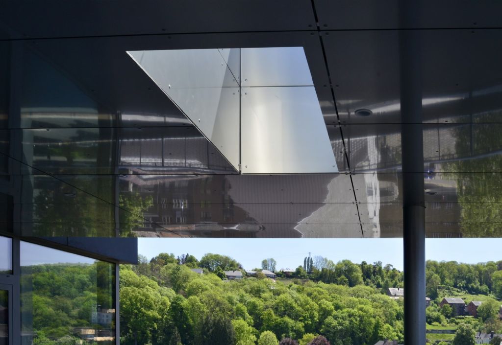 « Notre expérience muséographique, ainsi que les contraintes de contrôle climatique et de luminosité liées à la conservation des œuvres nous conduisent à proposer des plateaux d’expositions principalement en black-box », explique Gil Honoré lorsqu’on évoque les entrées de lumière dans le bâtiment. « Nous avons cependant conservé le fenestrage de l’ancienne façade courbe au Sud, qui regarde la vieille ville et la collégiale, et nous avons par ailleurs créé une très grande baie au R+3 en façade Nord-Ouest, afin d’offrir un lien visuel fort avec la ville. »