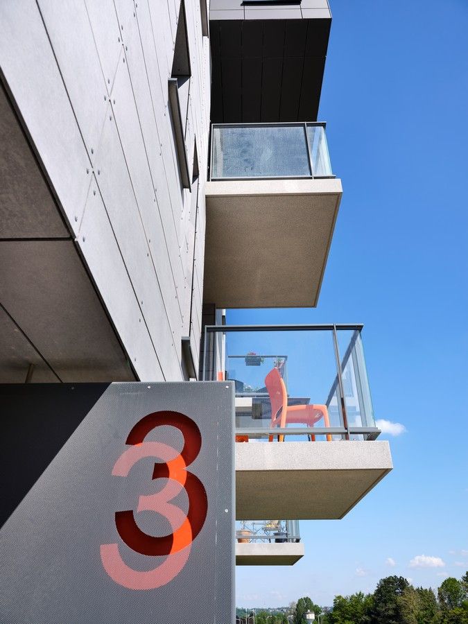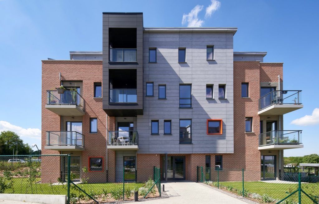 Du béton architectonique gris a été utilisé pour les 50 terrasses des appartements. Les éléments constituant les terrasses ont été livrés par SVK ELBETON. Julie Delorge, chef de projet pour le bureau d'architecture Atelier de l’Arbre d’Or : « Pour l’écoquartier, nous avons porté une grande attention aux façades des différents bâtiments. Pour les appartements, nous avons défini une image spéciale avec le partenaire associé du bureau Bernard Voglet. La façade est une combinaison de briques rouges et beiges, avec un certain nombre de sections de façade en panneaux d’Eternit. Nous trouvions que les balcons gris en béton architectonique s’intégraient bien. La finition acidée s’accorde bien avec la structure de la façade. L’entrepreneur a décidé de travailler avec la SVK Elbeton. Nous avons déjà travailler avec des éléments provenant de chez SVK par le passé pour d’autres projets et l’expérience n’est que positive. »