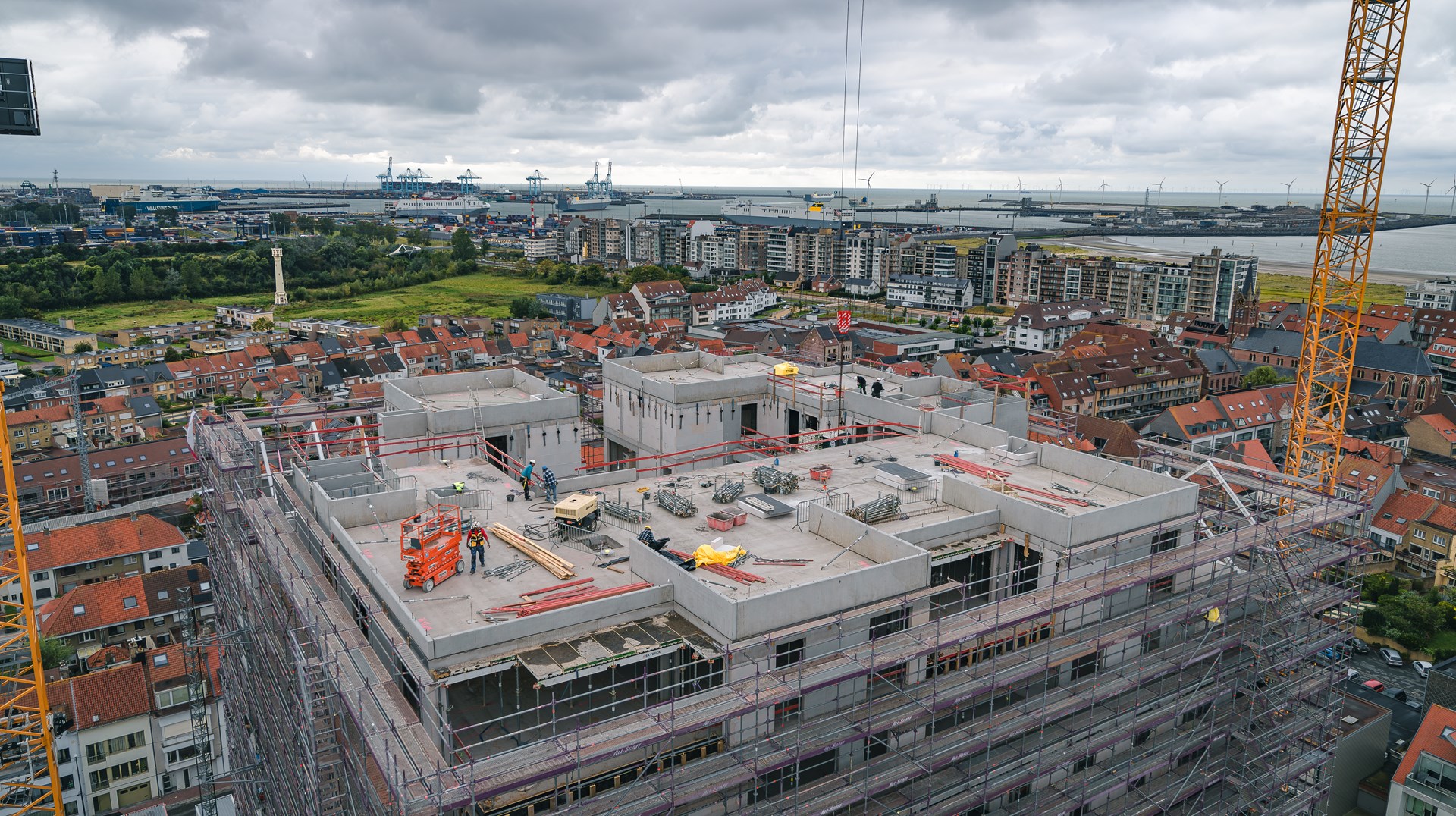 Le chantier de Hoost poursuit son développement à grande vitesse. Actuellement, les travaux de pose des sols sont en cours dans les niveaux inférieurs, tandis que les finitions des appartements prennent forme. Dans les étages intermédiaires, l’installation des systèmes techniques avance à bon rythme. Quant aux niveaux supérieurs, les dernières interventions de gros œuvre se sont achevées, et les fenêtres seront bientôt posées.