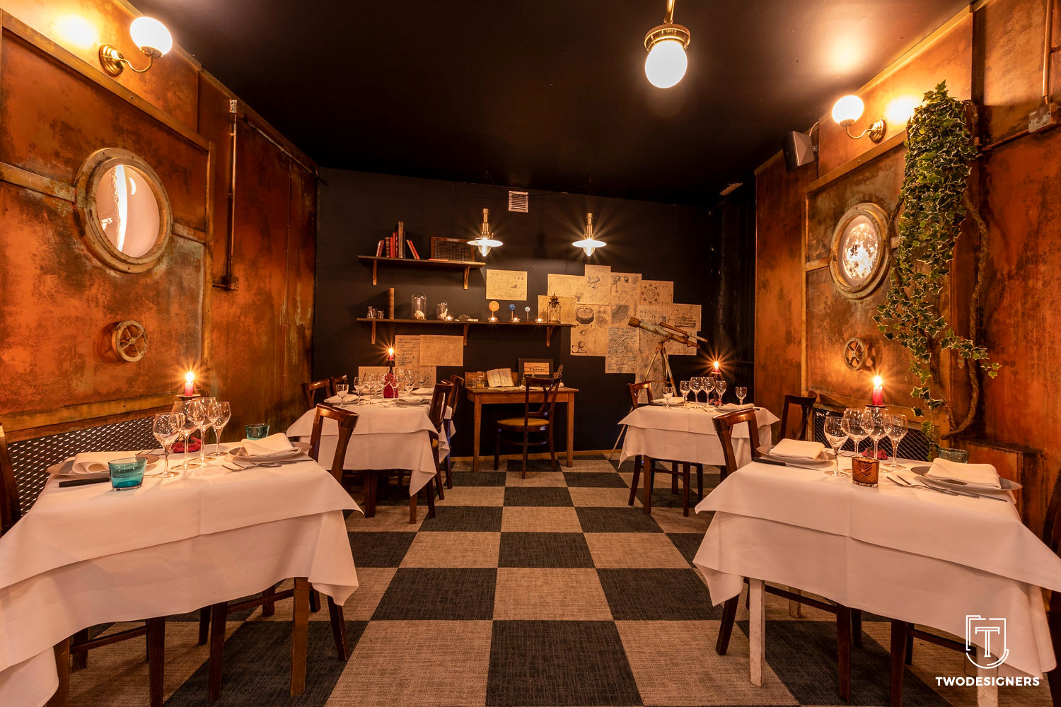 Derrière la ligne à ne pas franchir, vous arrivez dans le laboratoire abandonné d’un chercheur passionné par la Lune. Entre vieux plans accrochés aux murs et matériaux rouillés, Twodesigners et son équipe ont créé un décalage temporel pour proposer la meilleure des expériences. Accorder nourriture d'excellente qualité et cadre esthétique spécialement conçu pour plaire, c’est promettre un moment que les visiteurs ne vont pas oublier de sitôt !