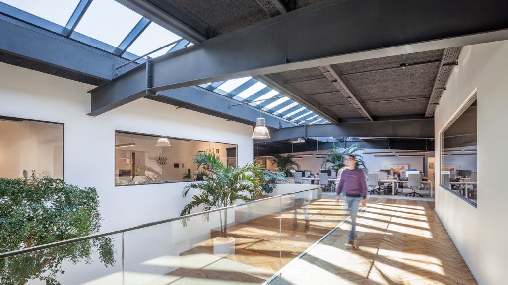 Un ancien entrepôt est devenu le siège de la société informatique DSL. Le hall existant en poutres d’acier, qui présentait une haute qualité architecturale, a été conservé et repeint pour mettre la structure porteuse en valeur. Le concept circulaire visait à adapter l’entrepôt tout en préservant le caractère brut du bâtiment.