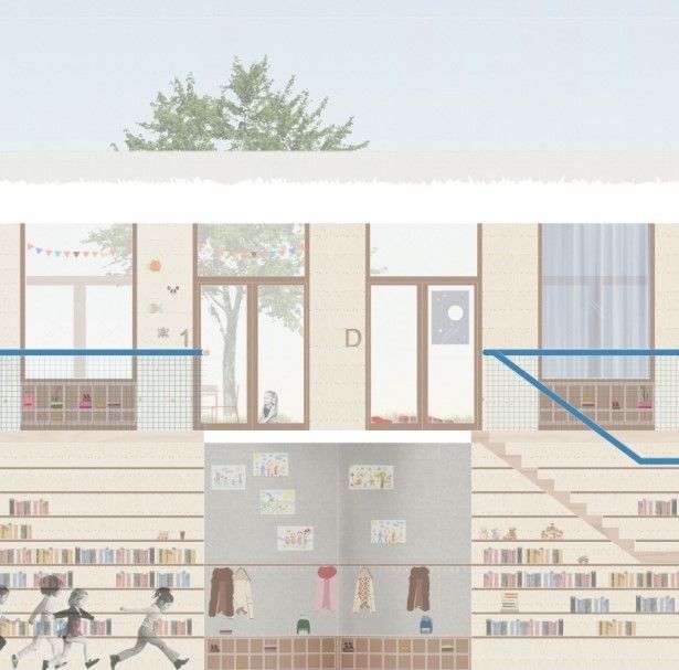 « Vue en coupe, l’école est organisée en deux niveaux, à la façon des maisons du quartier qui s’implantent dans la pente avec un étage au niveau de la rue, et un étage au niveau du jardin. La section maternelle occupe le niveau supérieur, aligné avec l’entrée, tandis que la section primaire occupe le niveau inférieur, aligné avec le verger public. Chacun des deux niveaux possède une séquence d’espaces de plain-pied associant horizontalement classes, jardins pédagogiques, auvents et cour. L’ensemble est relié par une généreuse galerie centrale sur double hauteur. Elle est rythmée par un jeu d’escaliers, de passerelles, de niches et de murs bibliothèques qui favorisent les relations entre les deux sections. Le profil de l’école est suffisamment bas pour ne pas obstruer la vue depuis les maisons au nord. »