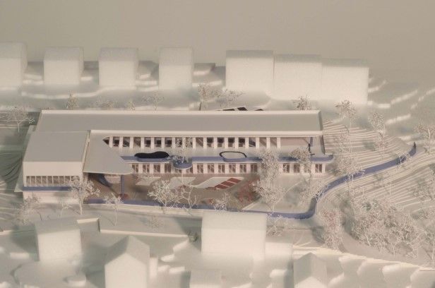 « Perçu depuis le site actuel de l’école, le paysage paraît fermé par la topographie et fragmenté par les infrastructures », explique-t-on sur le site de Matador. « Mais, vu d’en haut, le paysage redevient ouvert et lisible. Le regard s’étend jusqu’à l’horizon des collines voisines. On voit la course du soleil. Le premier principe est donc de concevoir l’école comme un long balcon tourné vers le paysage. En contrepartie, un volume contenant les fonctions bruyantes (sport, fête, réfectoire) est implanté parallèlement à l’autoroute pour protéger les espaces de classe et de récréation contre le bruit de cette dernière et des vents importants sur la ligne de crête. »