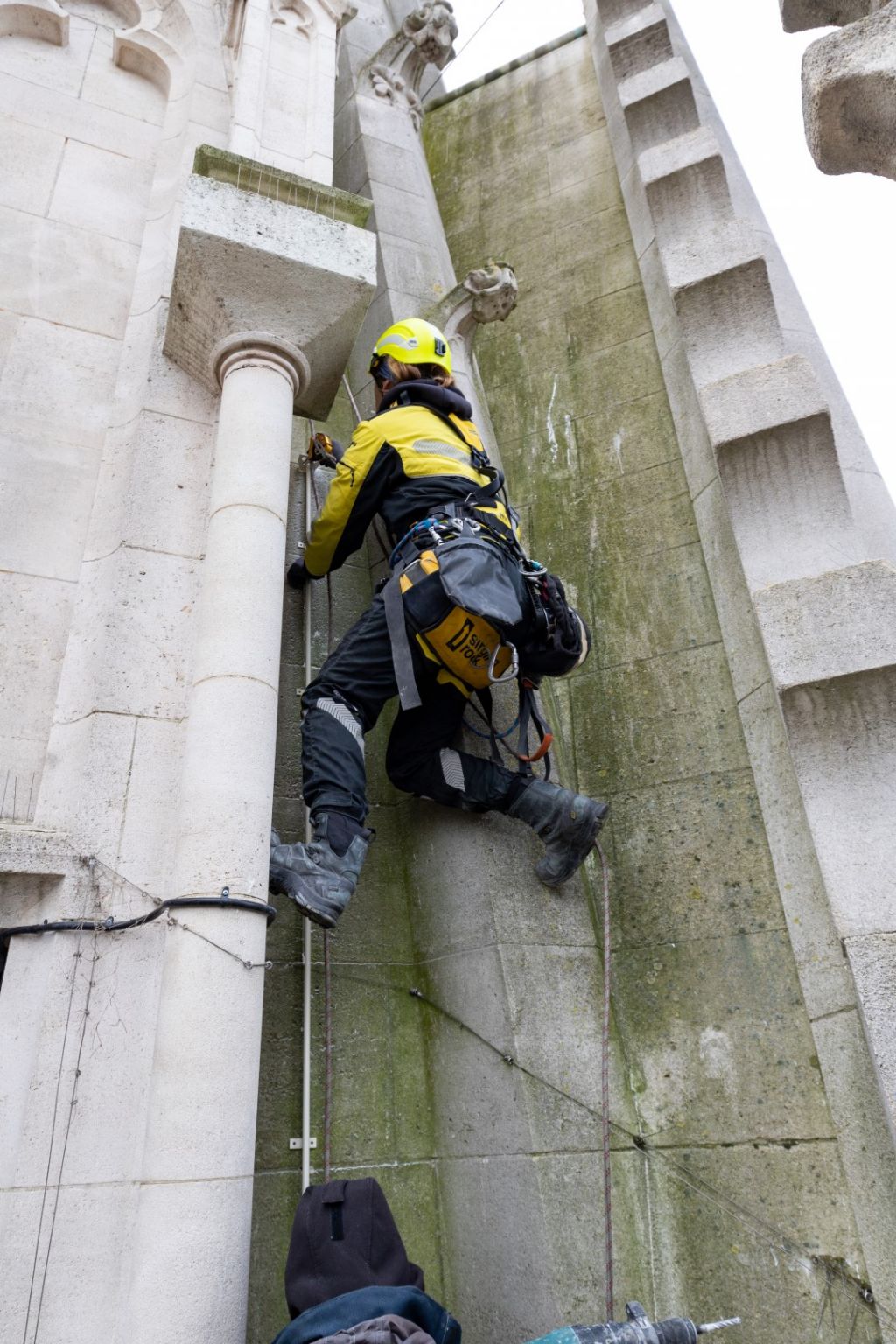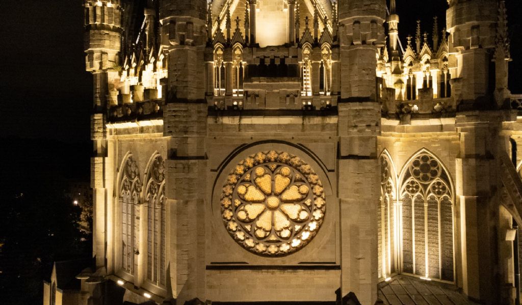 350 projecteurs et 5 km de câbles ont été nécessaires pour éclairer l’ensemble des façades. Les luminaires ont été principalement installés sur le bâtiment, réduisant ainsi la pollution lumineuse pour les riverains. On compte 18 types d’ancrages différents, choisis pour créer un éclairage subtil et respectueux du patrimoine. Le matériel d’éclairage est discret et à peine visible depuis le parvis de l’église.