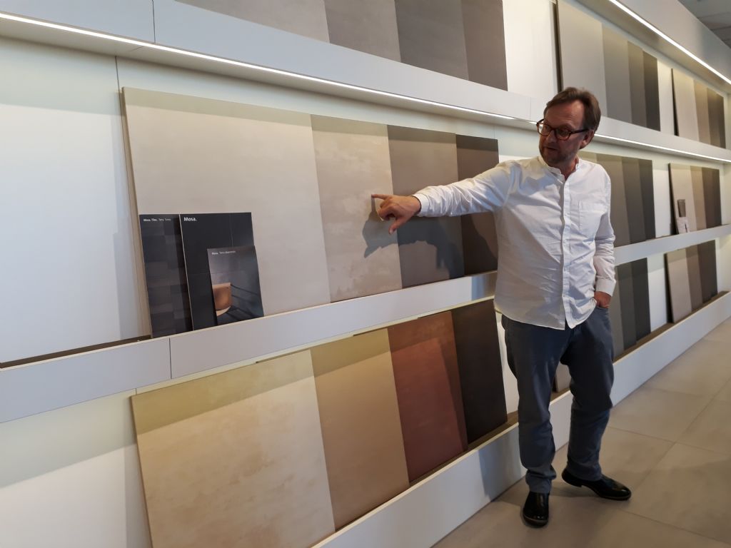 Comme la visite de l'usine l'a montré, tout carreau Mosa est un produit "pure céramique". C'est clairement une des marques de fabrique de l'entreprise. L'aspect mat des carreaux en est une conséquence, mais aussi une force par rapport aux carreaux dont la face supérieure est imprimée. On ne trouvera donc pas chez Mosa des carreaux imitant ceci ou cela, mais des produits à l'aspect naturel dont le format maximal (100 cm x 100 cm) n'est limité que par la taille de la presse.