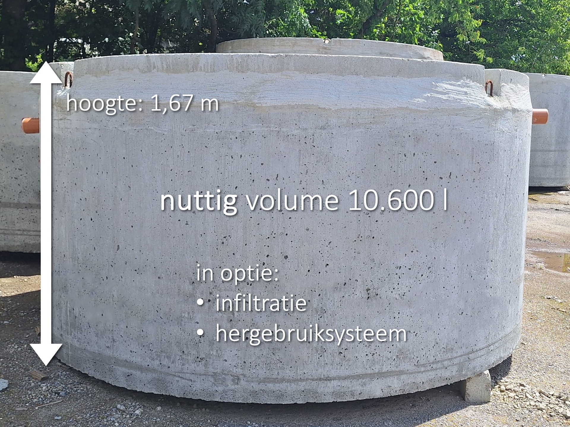 Ecobeton propose les citernes les plus basses de 5.000 L, 7.500 L, 10.000 L et désormais aussi 12.500 L disponibles sur le marché, qui peuvent également être couplées pour augmenter le volume.
