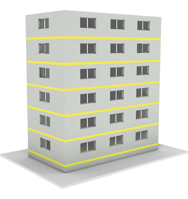 - pour les autres bâtiments (h entre 10 et 36 m) : solutions types basées sur une interruption régulière de l’isolation combustible (dans le cas des ETICS) ou de la coulisse (dans le cas d’un revêtement de façade avec lame d’air ventilée).